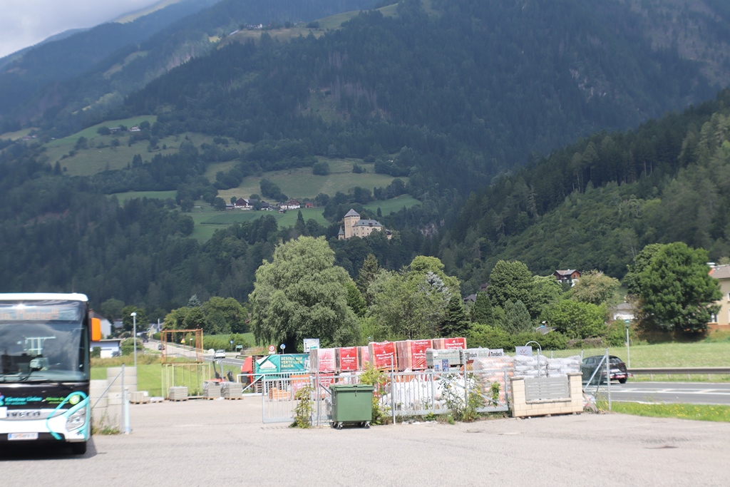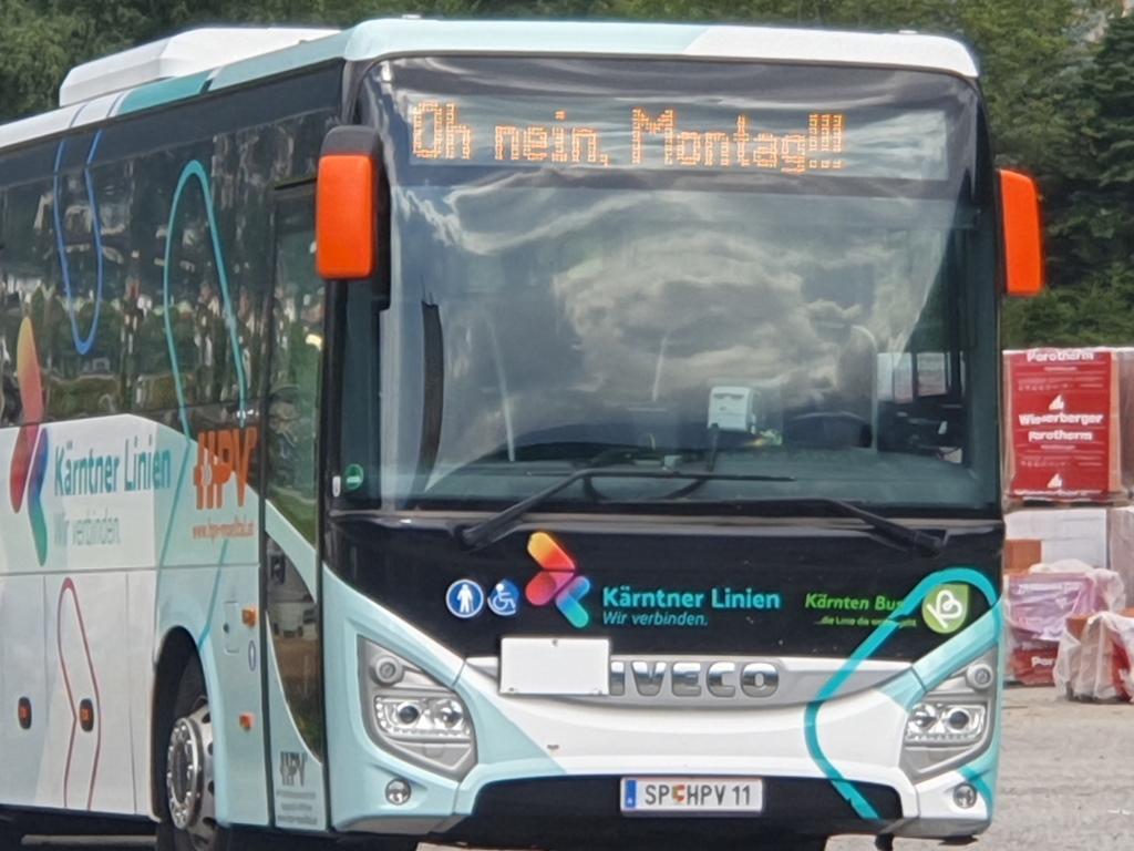 So waren wir zuversichtlich, dass wir zumindest die nächsten Stunden unserer Tagesetappe im Trockenen schaffen würden. Die drei Motorräder waren gepackt und so fuhren wir hinunter ins Tal auf die Felbertauernstraße nach Lienz. Dort hielt uns zwar der übliche Stau etwas auf, aber gleich am Stadtausgang verließen wir den Kreisverkehr Richtung Iselsberg. Auf der Passhöhe zweigt zwar die Großglockner-Hochalpenstraße ab, wir wollten aber weiter ins Mölltal. Wir bogen daher rechts auf die B106 und genehmigten uns in einem Kaffeehaus an einer Tankstelle eine kleine Kaffeepause, gleich daneben präsentierte ein Reisebus seinen Montagsgruß.