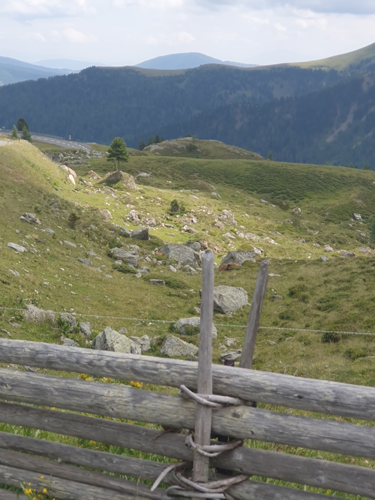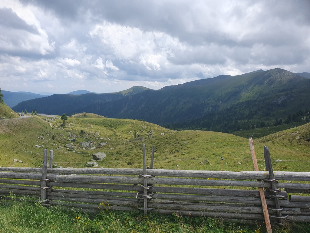 Die B99 mit dem Blick immer wieder hinauf zur Tauernautobahn war dann bis Kremsbrücke unsere weitere Wahl. Dort kam der erste Wegweiser für das nächste Ziel, die Nockberge. Weg von der großen Bundesstraße waren die Kurven wieder mehr motorradgerecht, sprich kürzer und knackiger, bis die Abzweigung, nun wieder Richtung Süden auf die Nockalmstraße, die 1981 primär als touristische Panoramastraße eröffnet wurde. Auf einer Länge von 35 Kilometern schlängelt sie sich die über 52 Kehren (Reidn) zwischen Innerkrems und Reichenau über die charakteristische Landschaft der „Nockis“. Die Tageskarte kostet 2025 für Motorradfahrer 18 Euro, was zwar kein Geschenk ist, aber den Fahrspaß auf jeden Fall wert ist. Leider wurden die Wolken immer finsterer und so gab es nur einen Fotostopp.