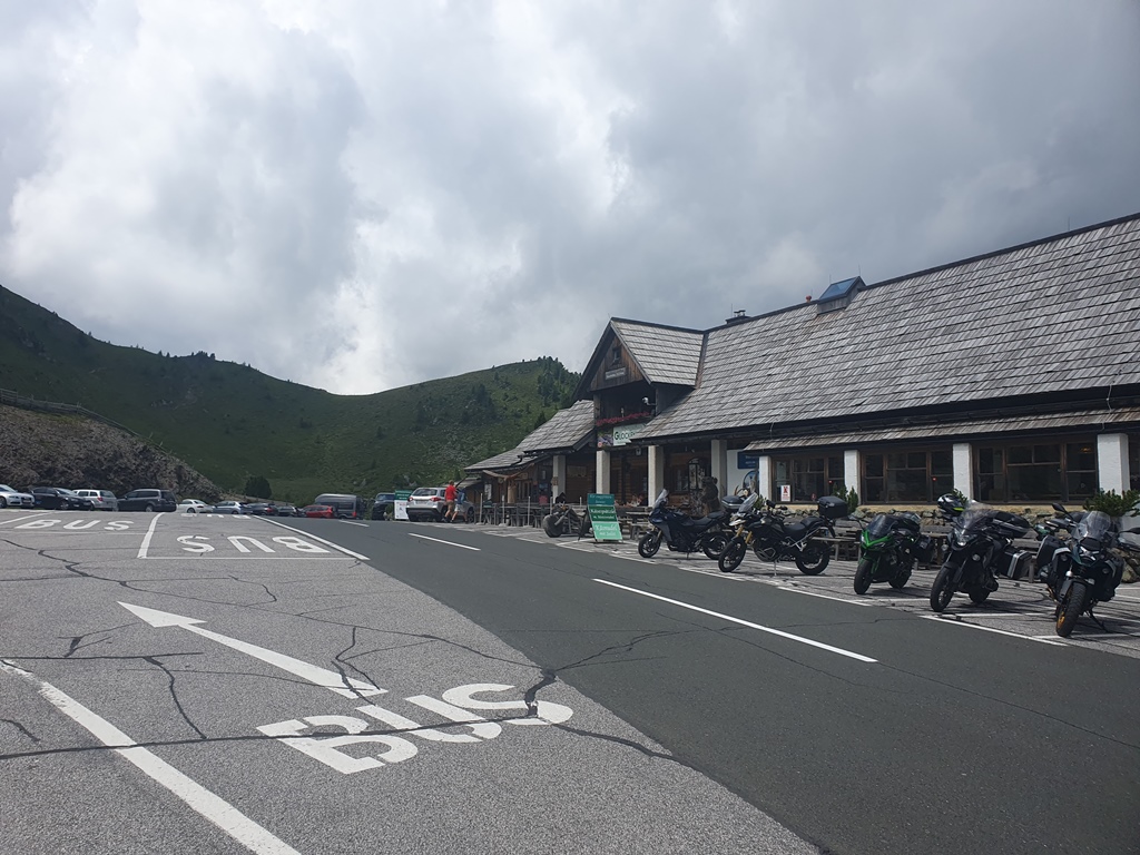 Je weiter wir hinunter kamen, desto heller wurde es und wir dadurch zuversichtlicher, dass wir unser nächstes Ziel, die Passhöhe der Turrach trocken erreichen können. So war es dann auch und wir parkten bei Sonnenschein vor dem nicht nur bei Motorradfahrern bekannten Hotel Kornock ein.