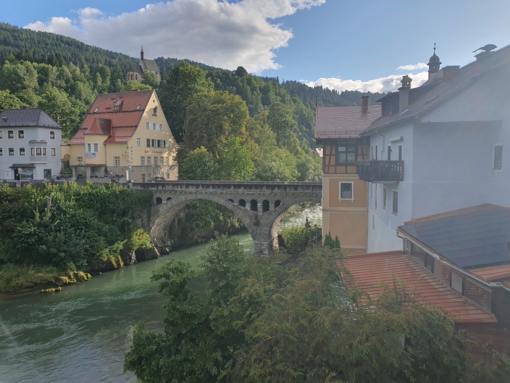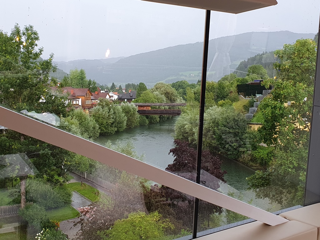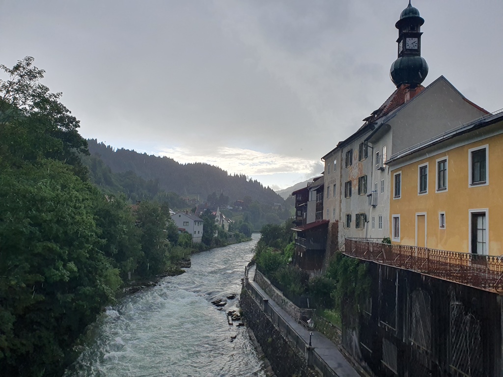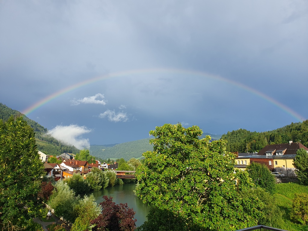 Nach einer kleinen Ruhepause mussten wir uns die Beine vertreten und entdeckten beim Rundgang durch die recht malerische Altstadt das „Open Space„, eine Tagesbar mit mutiger Architektur und genialem Ausblick über die Mur. Ein wunderschöner Regenbogen rundete neben guten Cocktails den Nachmittag ab.