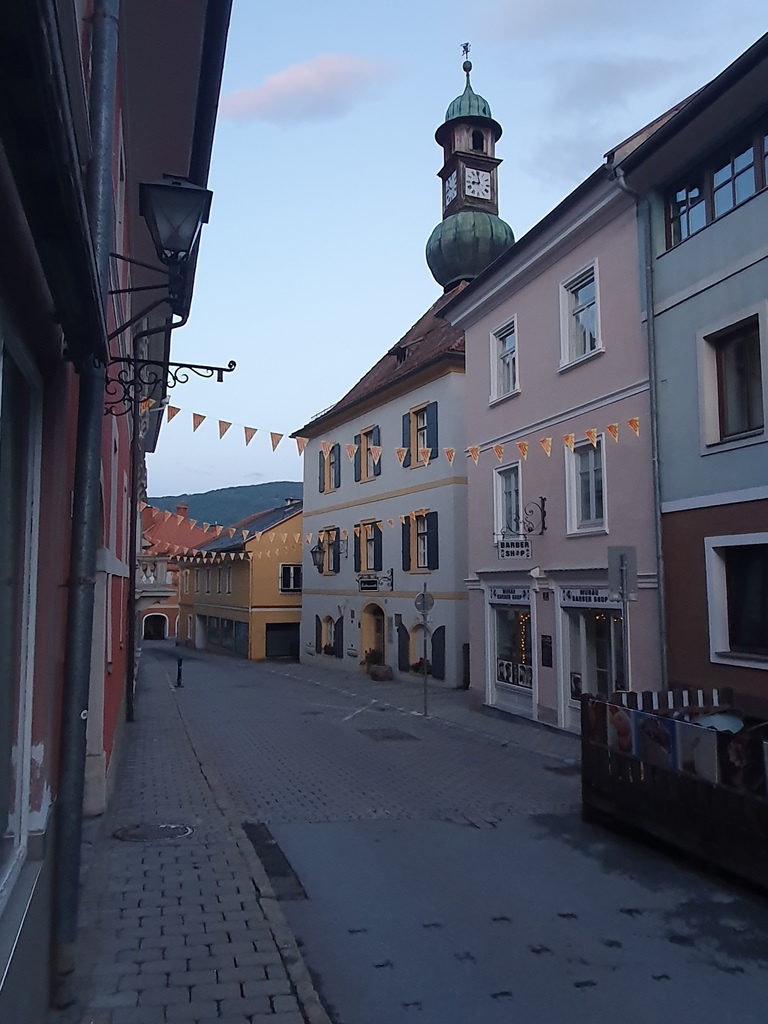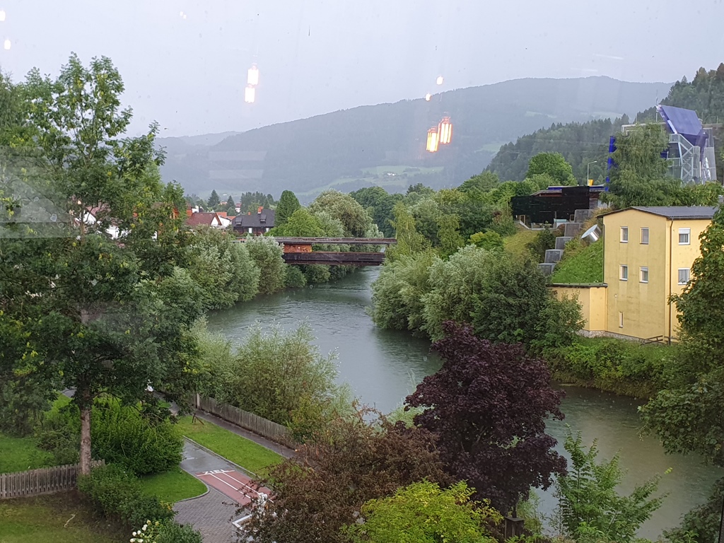 Leider begann es hier während des Mittagessens zu tröpfeln und die Wolken wurden immer dunkler. Das hieß für uns: lieber rein in die Regenkombi und bald weiter. Unser Tagesziel Murau war gar nicht mehr sehr weit entfernt, die längere Strecke über Tamsweg wären 70 Kilometer gewesen, aber in Anbetracht des Regens bogen wir doch in Predlitz rechts auf den um fast 30 Kilometer kürzeren Weg ab. Ob es wirklich die bessere Wahl war, sei dahingestellt. Nach einer ewig langen Rotlichtphase hatten wir eine kilometerlange Baustelle mit Sand und Schotter, wodurch unsere Bikes entsprechend verdreckt waren, obwohl es in der Zwischenzeit zu regnen aufgehört hatte. Darum ließen wir die Ehefrauen meiner Freunde beim Hotel einchecken und wir fuhren gleich zum Waschplatz bei der nächsten Tankstelle.