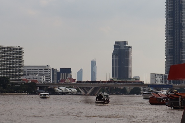 Da das hungrig machte, fuhren wir nach dem Fußweg über die 3 Stockwerke mit dem Lift 74 Etagen nach unten, wahnsinnig schnell, aber überraschenderweise ohne etwas davon zu spüren. Wir stiegen in die Hochbahn und fuhren bis zur Station Saphan Taksin, von wo es nur wenige Schritte zur Schiffsanlegestelle Sathorn Pier sind. Mit dem nächsten Boot kamen wir rasch zu unserem Restaurant direkt am Fluss bei der Station Ratchaprasong. Wie es dort war, könnt ihr hier in meinem Blog über das Essen in Bangkok nachlesen: