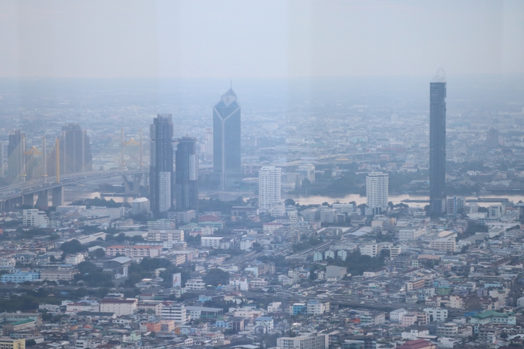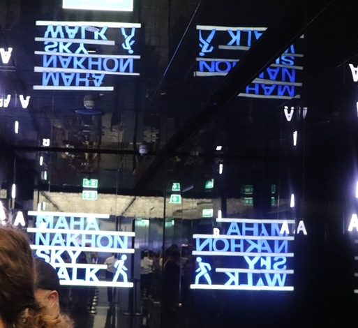 Wir bekamen den Tipp von der Schwester meiner Frau, das höchste Haus Bangkoks, den Mahanakhon Tower mit seinem Glasboden auf rund 310 Metern Höhe unbedingt anzusehen. Und so reservierten wir bereits einige Wochen vorher die Tickets und fuhren dann mit der Hochbahn zur Station Chong Nonsi, von wo aus man dieses markante Bauwerk gar nicht so leicht erkennt wie aus einigen Kilometern Entfernung, wo die markante Architektur sofort heraussticht.