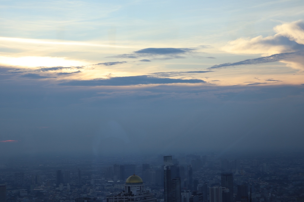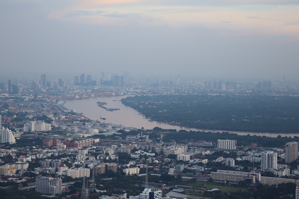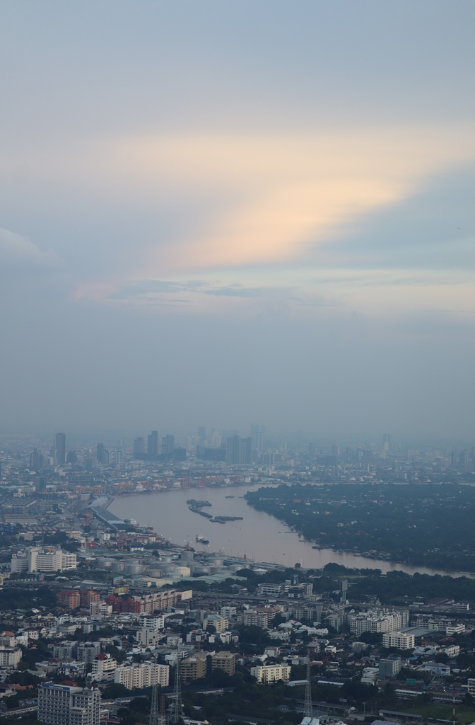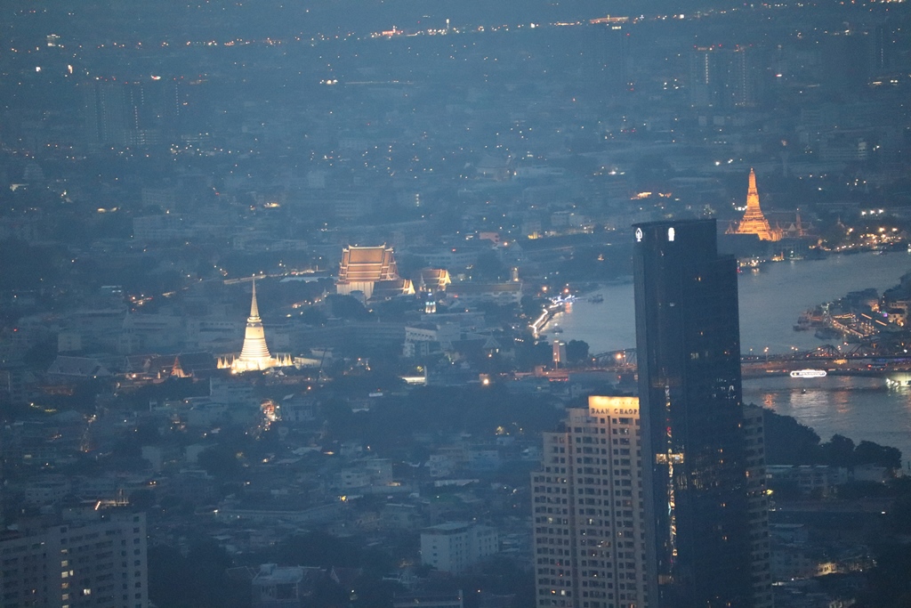 Dort gibt es einige Tischchen die man mit einer Mindestkonsumation von 1000 Bath (rund 27 Euro) pro Person reservieren könnte. Wir waren aber zu spät, der Blick von der Publikumstribüne über den Fluss Chao Phraya Richtung Sonnenuntergang war aber auch so beeindruckend genug. Leider war der Horizont etwas dunstig, so verschwand der rote Feuerball Sonne darin und war nicht ganz so spektakulär wie erhofft. Trotzdem können wir nur empfehlen, diesen Ausblick rechtzeitig zu reservieren und einen Zeitslot zum Sonnenuntergang, der speziell angeboten wird, zu nehmen.