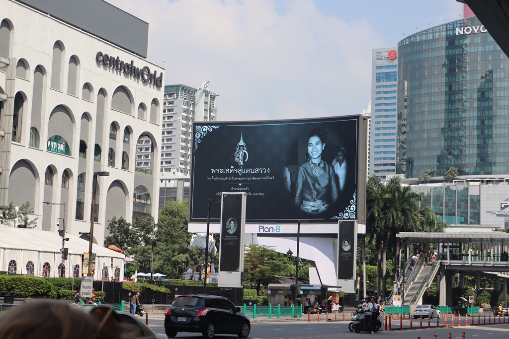 Auch dort, wie an vielen anderen Stellen in Bangkok und ganz Thailand wurde der am 24. Oktober 2025 im 93. Lebensjahr verstorbenen ehemaligen Königin Sirikit gedacht. Es folgt ein Jahr Trauer, bis sie im Oktober 2026 mit höchsten Ehren auf einem Sandelholz-Scheiterhaufen im Herzen von Bangkok eingeäschert werden wird.
