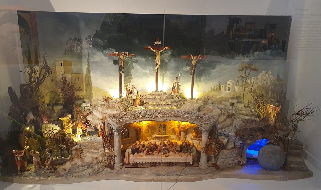 Die untenstehende Fastenkrippe war im Jahr 2023 als eines von vielen Exponaten bei einer Ausstellung im Diozösanmuseum in St.Pölten zu sehen. Sie zeigt in einem großartigen Szenario das letzte Abendmahl, den Ölberg mit Jesus und den beiden Schächern und auch noch das leere Heilige Grab.