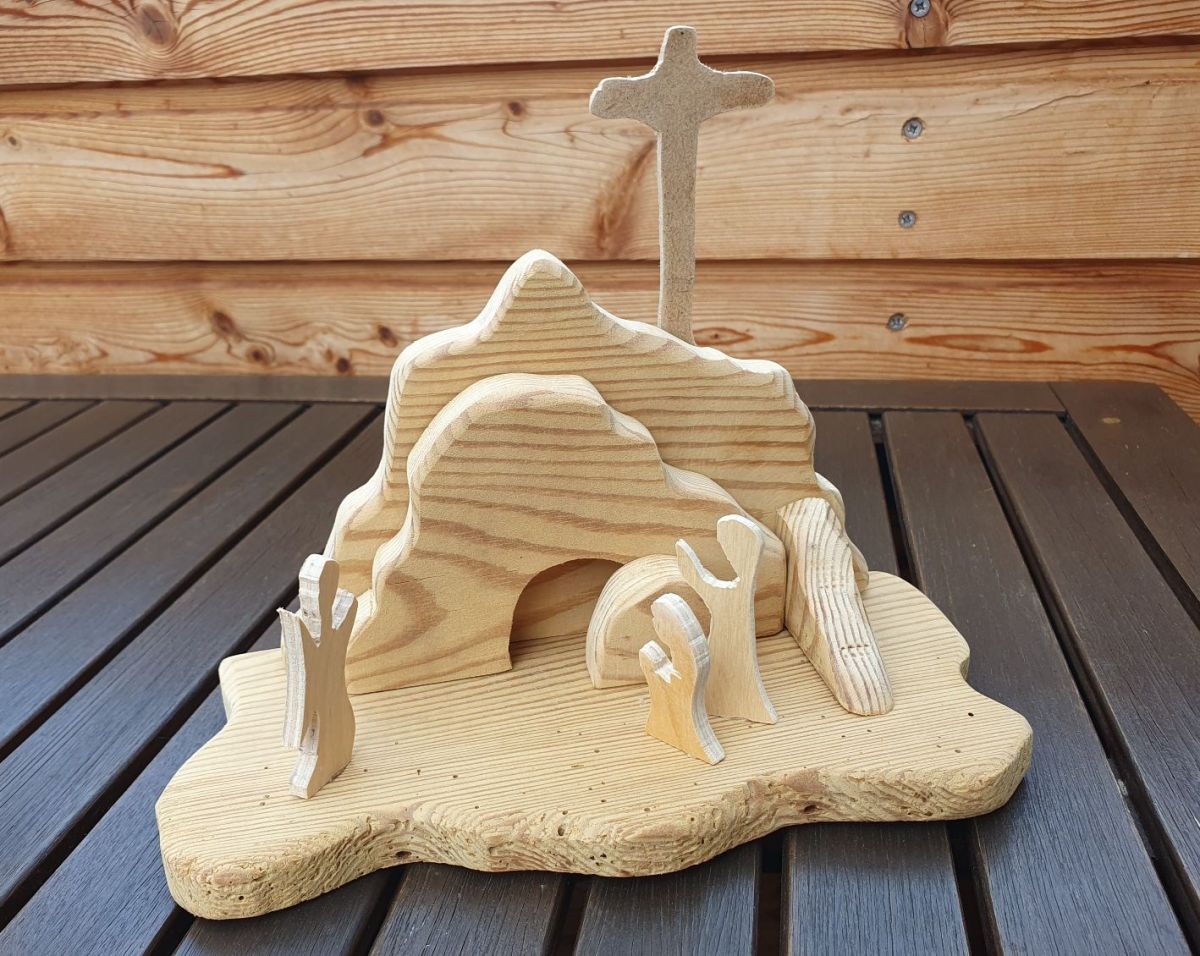Diese Fastenkrippe habe ich 2026 aus dem Restholz eines mehr als 100 Jahre alten Nachtkästchens aus Familienbesitz gebaut.