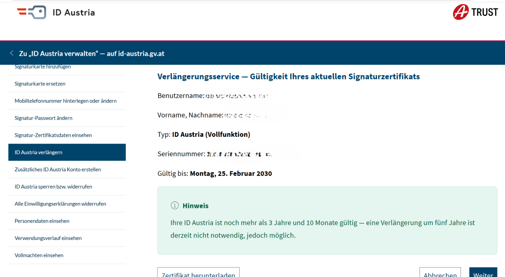 Mit „Weiter“ starten Sie die Verlängerung. Damit haben Sie ihr Zertifikat erfolgreich verlängert, das neue Gültigkeitsdatum finden Sie ganz unten an der von Vorhin bekannten Stelle (in der Regel sind es wieder weitere 5 Jahre).