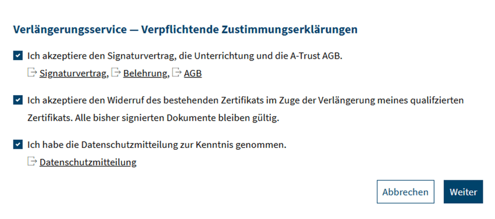 Bei der Verlängerung wird unter Verwendung Ihrer bestehenden qualifizierten Signatur ein neues Signaturzertifikat für fünf Jahre ausgestellt. Ihr altes Zertifikat wird dabei widerrufen, alle bisher signierten Dokumente bleiben gültig. Das müssen sie am nächsten Schirm mit den 3 Haken auch noch bestätigen: