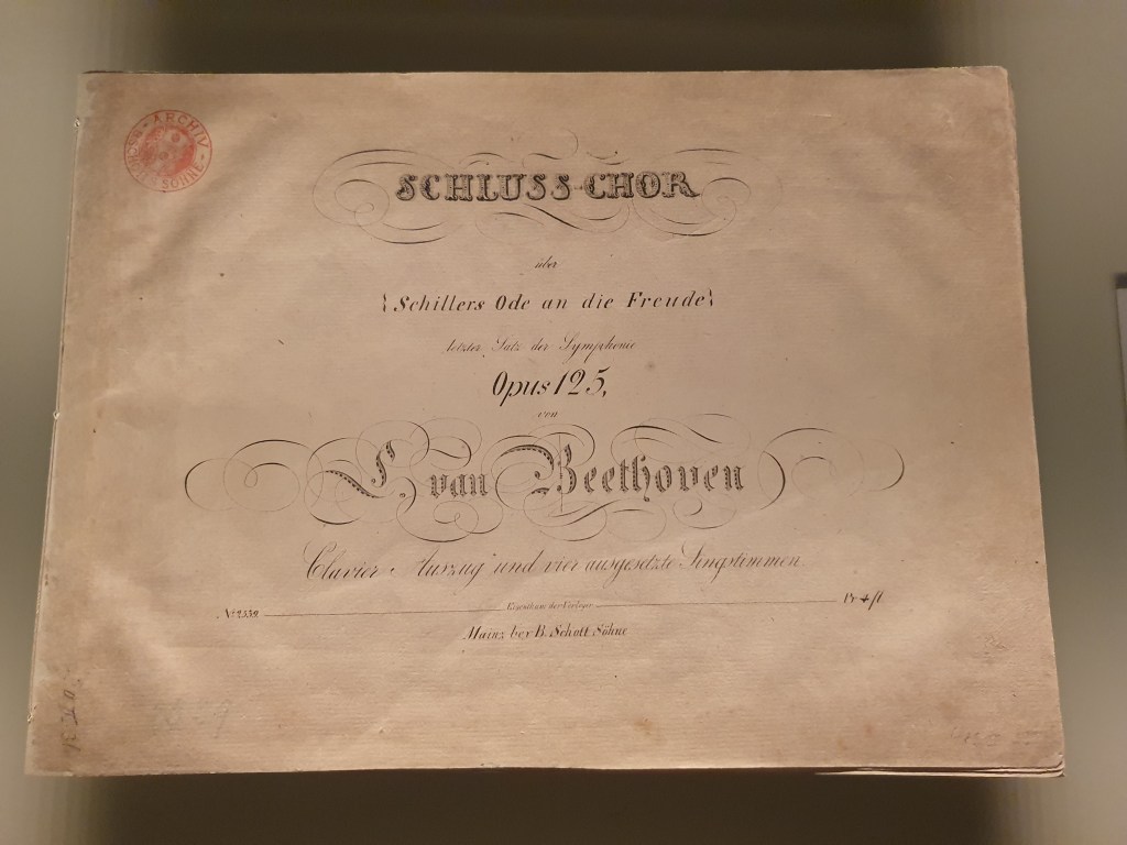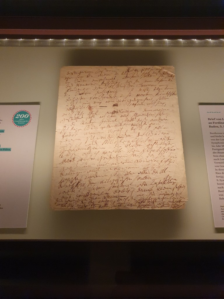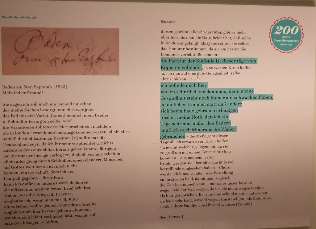 Derzeit widmet sich eine Sonderausstellung diesem Jubiläum und diesem Musikstück. Ein besonderes Highlight ist ein Brief, in dem Beethoven im September 1823 verspricht, die Partitur von op. 125 innerhalb der nächsten zwei Wochen zu liefern. Dieses Kleinod ist eine Leihgabe des Beethoven-Hauses in Bonn und beweist, daß diese wunderbare Melodie in Baden entstanden ist. Unten findet ihr den Link, wo man den Text des Schriftstücks sogar nachhören kann.