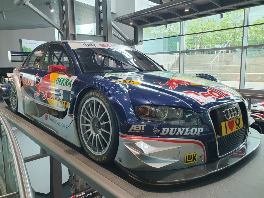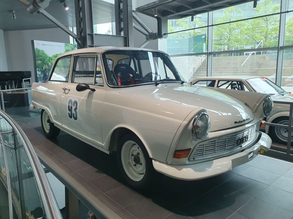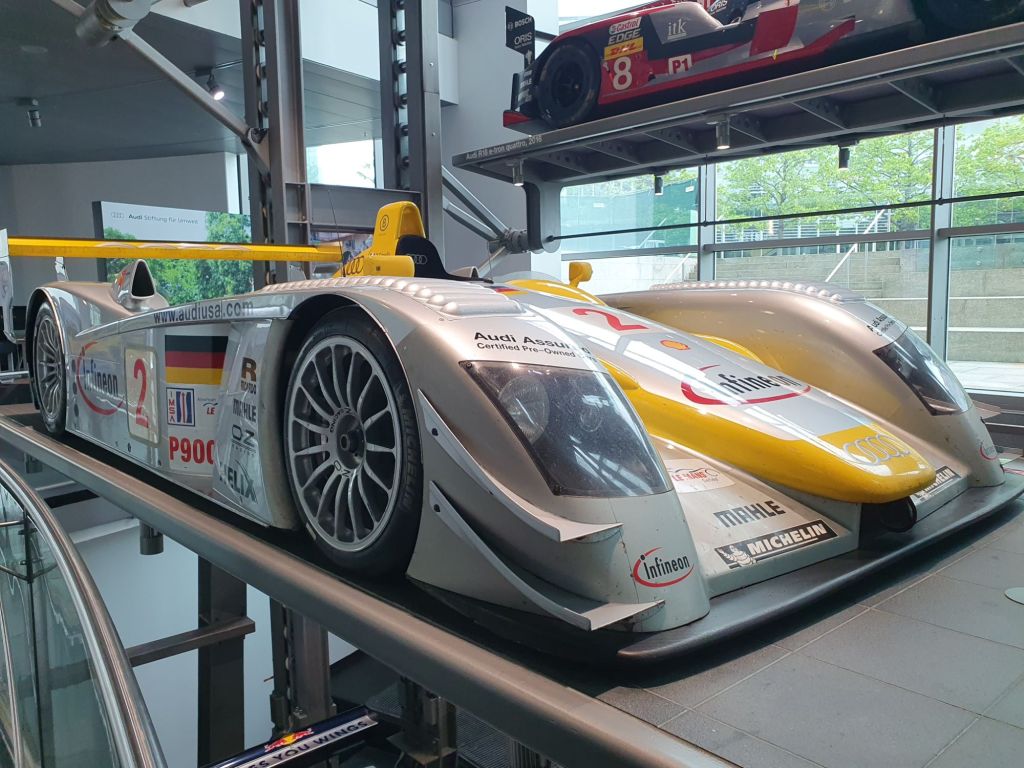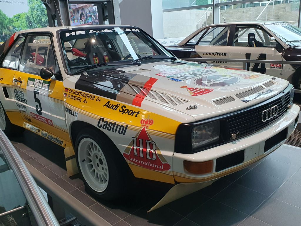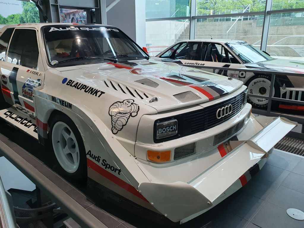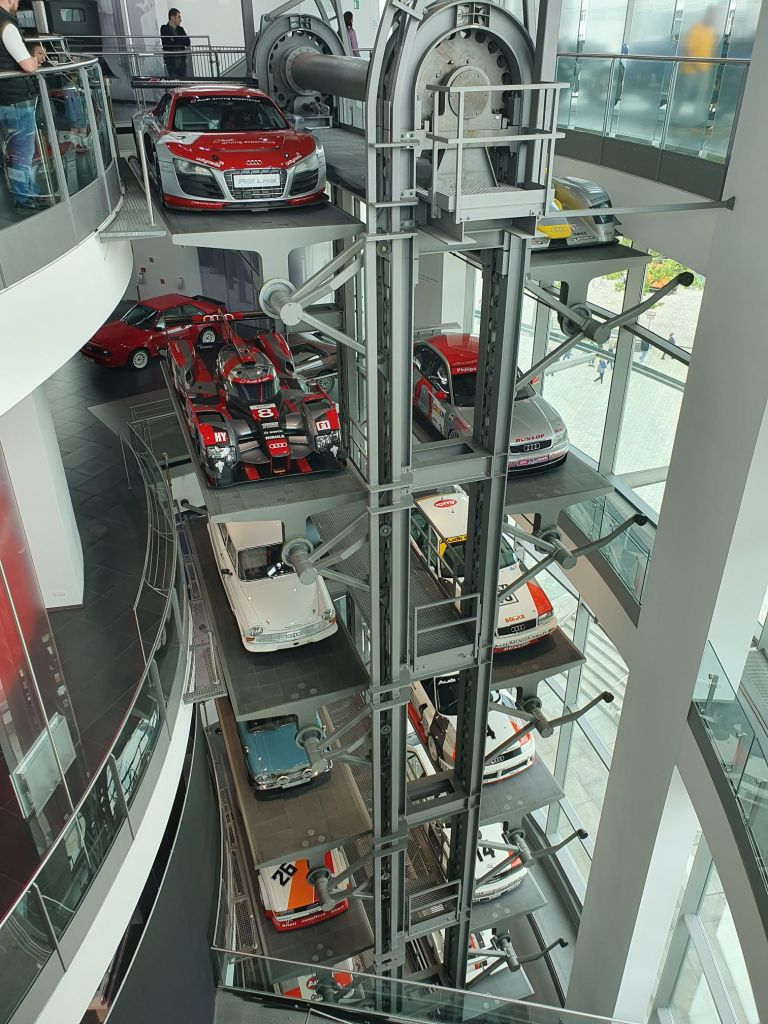 Doch das erste, was mir ins Auge stach, war ein über 4 Stockwerke gehender riesiger Paternoster. Wie ich erst zuhause herausfand, ist er mit 14 Plattformen der weltweit größte seiner Art. Hier wird die 50-jährige Motorsport-Geschichte von Audi zum Beispiel mit dem Audi A4 DTM-Sieger von 2007, dem Audi Le Mans Prototyp R8 LMP von 2002, dem Audi A4 STW von 1996, einem Audi Sport quattro Rallye Gruppe B von 1985, dem NSU 1300 TT „Jägermeister“ von 1975 sowie einem DKW F11/64 Tourenwagen von 1963 präsentiert. Der Audi Rallye quattro Gruppe 4 von 1980, den ich damals bei einem von mir veranstalteten Rodelrennen das erste Mal in Natura und nachträglich betrachtet recht zahm auf der glatten Schneefahrbahn unserer Rennstrecke erlebt hatte, stach mir natürlich besonders ins Auge.