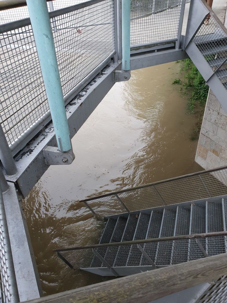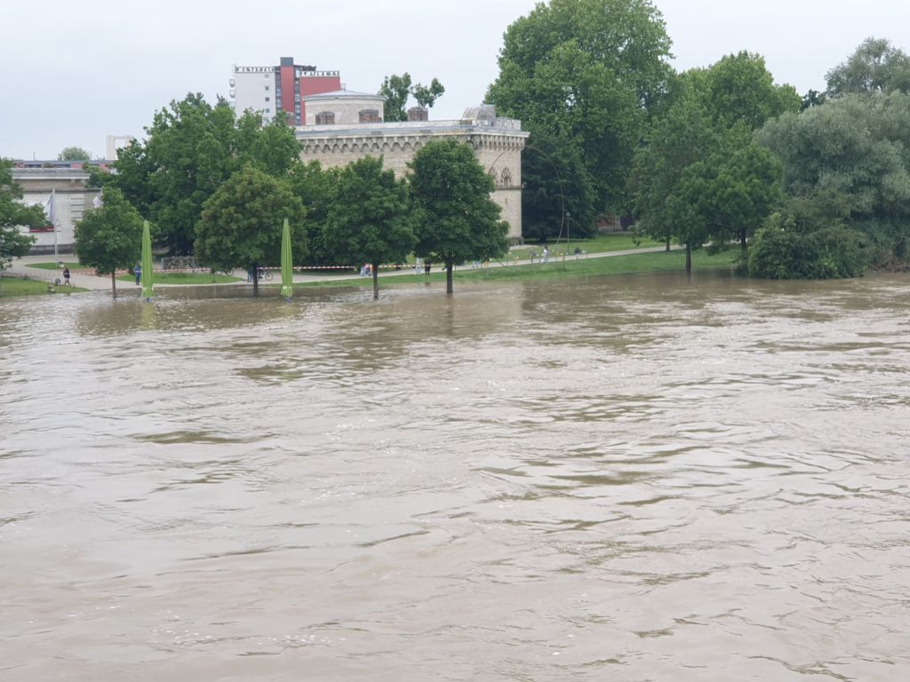 Nach dem Museumsbesuch checkte ich in einem kleinen Hotel in der Nähe der Altstadt ein, so konnte ich zu Fuß trocken die Altstadt erkunden. Die Donau war bis auf den Rand voll, die Wege am Ufer standen unter Wasser, an manchen Stellen waren es weniger als ein halber Meter bis auf das Straßenniveau.