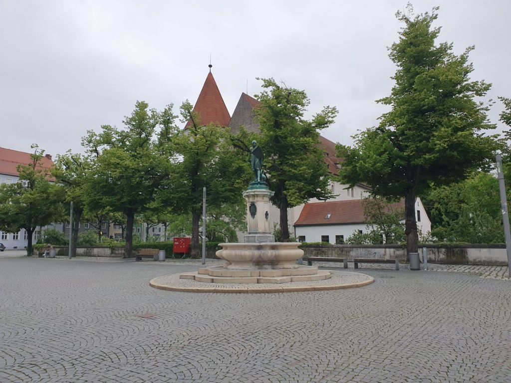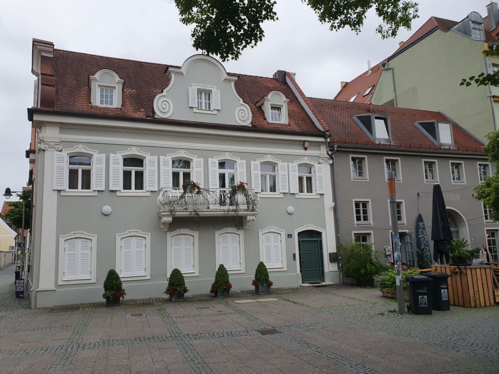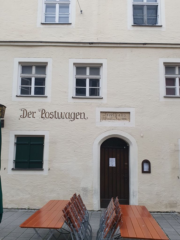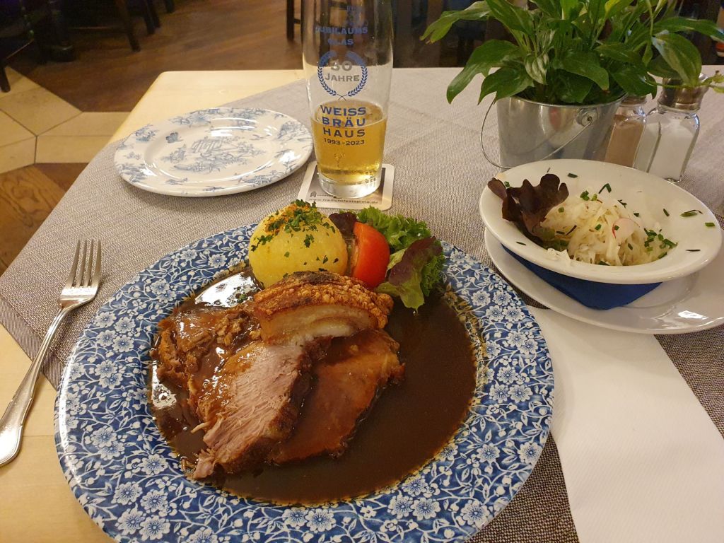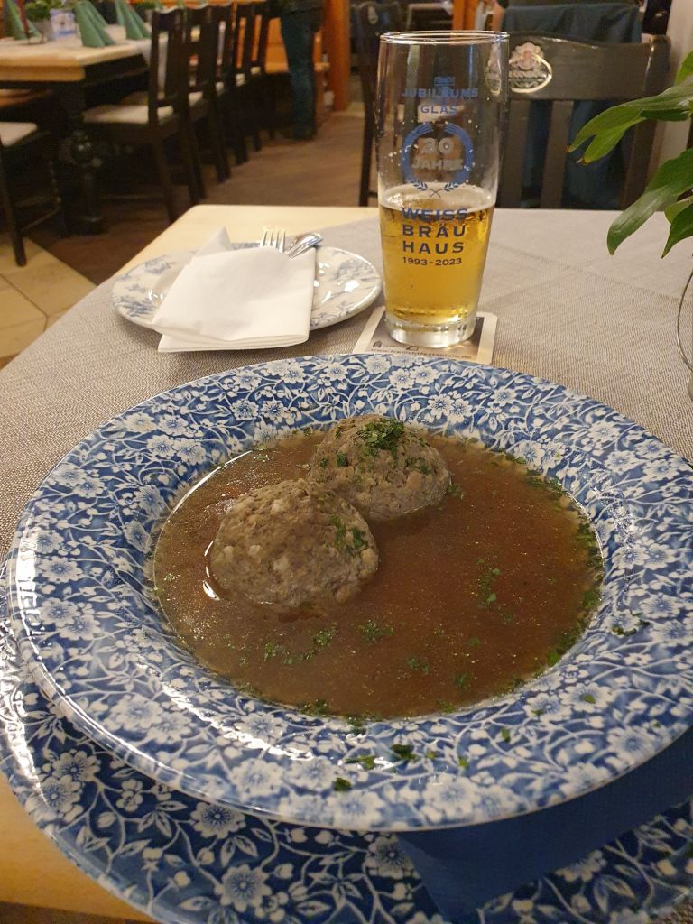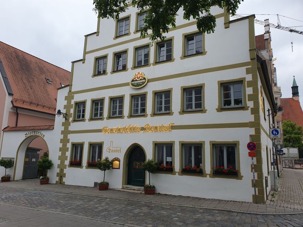 Ich entdeckte in der Fußgängerzone einen Braugasthof, wo ich mir neben einem guten Hellen eine Leberknödelsuppe und einen Schweinebraten mit Kartoffelknödel gönnte. Es war sehr gut und deftig, der Cholesterinspiegel schnellte sicher hinauf und mein Fußmarsch war mehr als egalisiert.