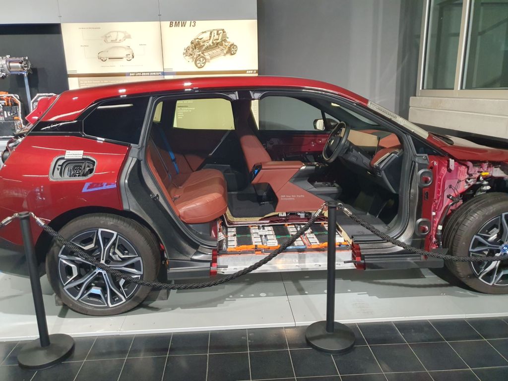 Als besonderer Blickfang präsentierte sich der zum ersten Mal auf der IAA 2021 gezeigte aufgeschnittene BMW iX xDrive50 mit seinen Lithium-Ionen-Akku, der im Unterboden zwischen den Achsen platziert ist und mit einer Netto-Kapazität von 105,2 kWh eine WLTP-Reichweite von bis zu 630 Kilometern ermöglicht.