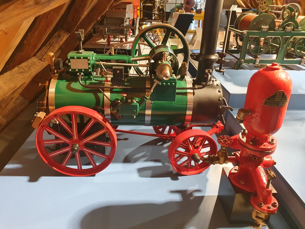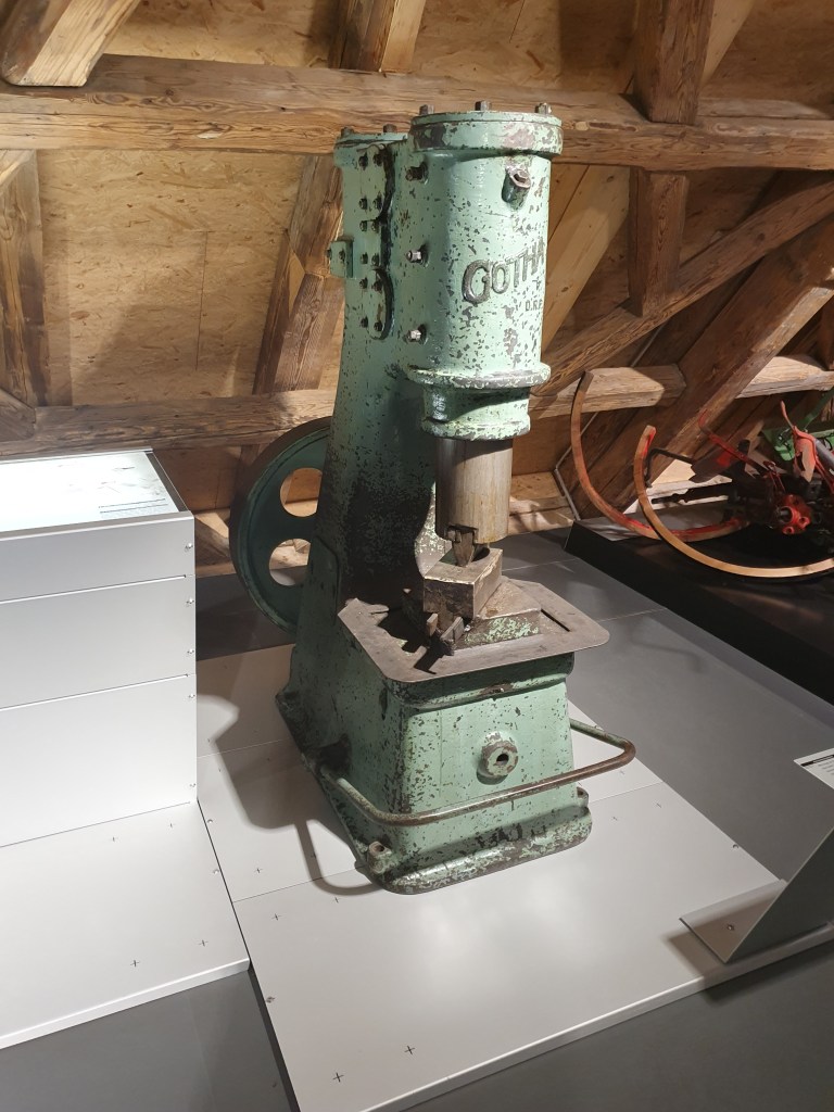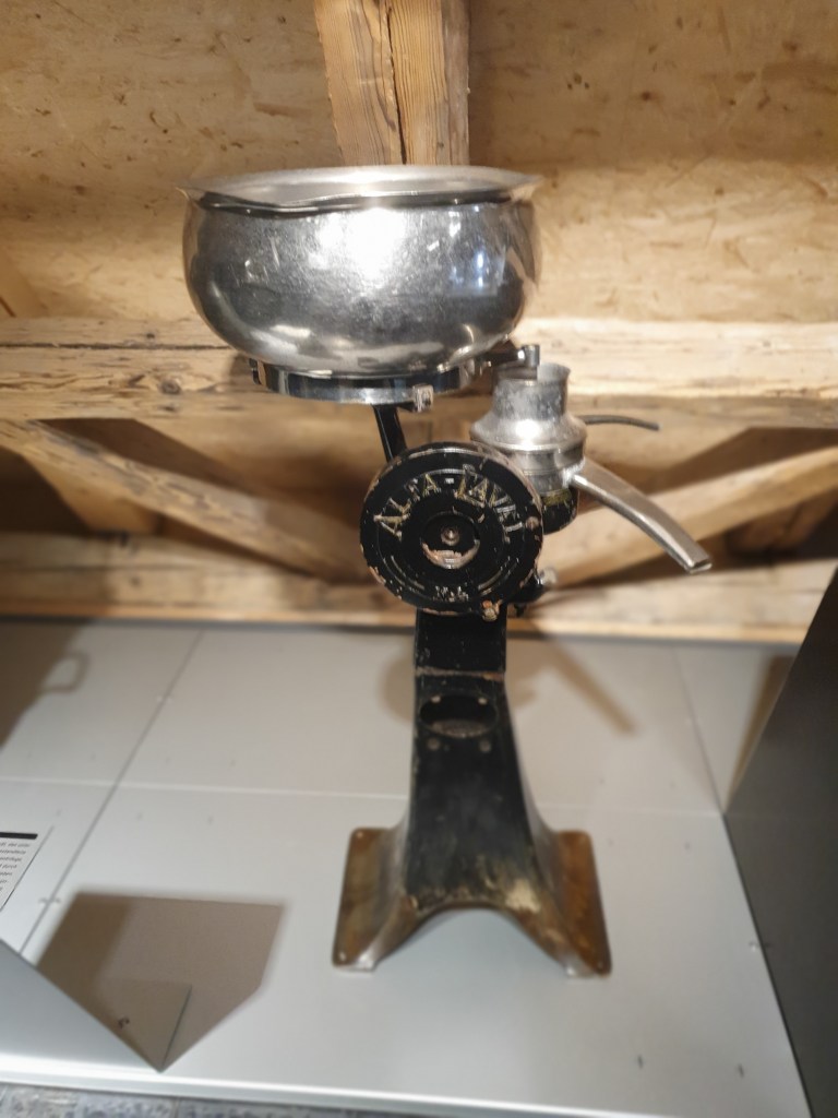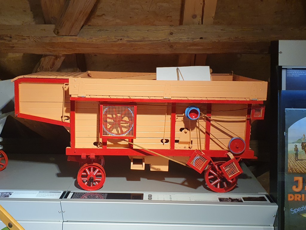 Gleich zu Beginn der Ausstellung im Museum für Industriegeschichte im 3.Stock entdeckte ich eine Milchzentrifuge, die mich an meine Kindheit erinnerte. Ich durfte auf einem solchen Gerät bei meinen Großeltern am Bauernhof noch in den späten 1960ern mit möglichst gleichmäßiger Geschwindigkeit drehen und so Rahm und Magermilch trennen. Ein weiteres landwirtschaftliches Gerät war die Dreschmaschine, die noch in den 1970er Jahren im Einsatz war.