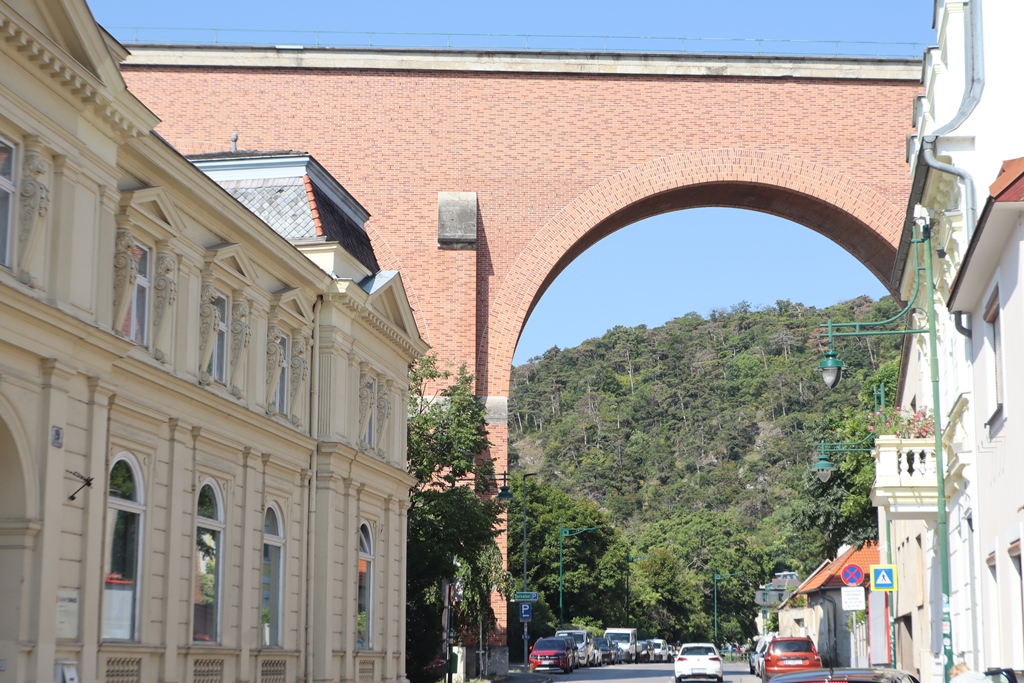 So bog ich kurz nach Hirtenberg nach St.Veit ab, wo die Straße aus dem Triestingtal hinaus über die Großauer Höhe nach Großau führt. Nach wenigen Kilometern war ich in der Kurstadt Bad Vöslau, die heuer 70 Jahre Staatsvertrag feiert. Die österreichische Delegation landete am 15.April 1955 nach den erfolgreichen Verhandlungen in Moskau am Flugplatz in Bad Vöslau. Das Stadtmuseum widmet dem eine Ausstellung, die noch bis 26.Oktober 2025 zu sehen ist, ich werde in einem späteren Blog noch darüber berichten.
