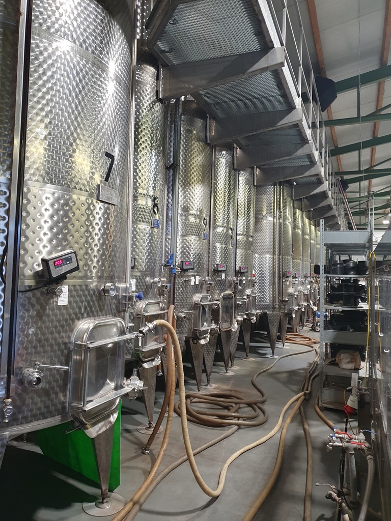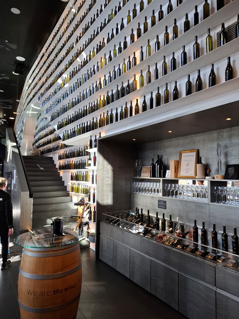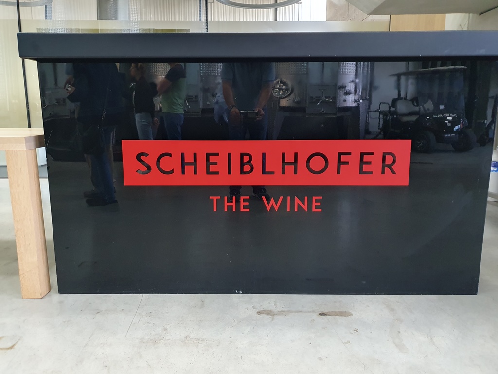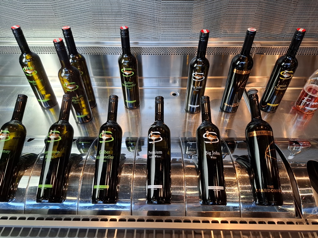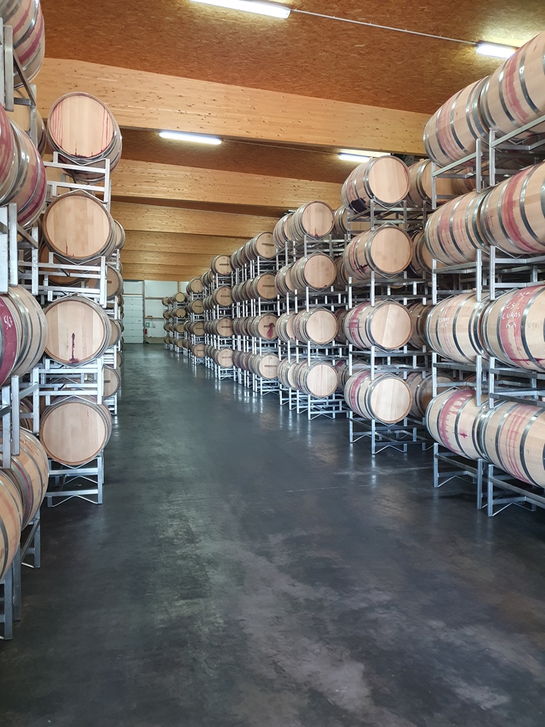Die Leiterin des Abhof-Verkaufs führte uns von der großen Traubenmühle vorbei an den 60.000l-Stahltanks und den Abfüllmaschinen bis zum Flaschenlager und der Halle mit den Barriquefässern aus amerikanischer Eiche, die nur einmal verwendet werden und dann gekauft werden können. Eine riesige Eventlocation, in der von Hochzeiten über Firmenevents bis zu Fernsehshows alles möglich ist, bildet den Abschluss der wirklich interessant gemachten Führung.