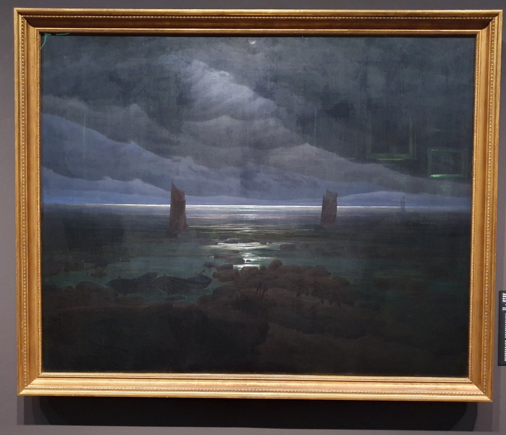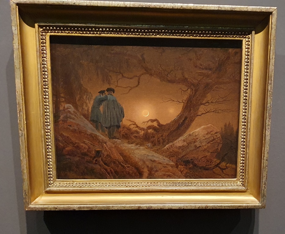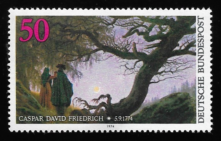 Das erste Mal hat mich dieser Künstler in den Bann gezogen, als ich 1974 als Briefmarken sammelnder Bub eine Marke der Deutschen Bundespost zum 200.Geburtstag von Caspar David Friedrich bekam, die das Gemälde „Mann und Frau den Mond betrachtend“ aus dem Jahr 1824 zeigt. Da sich dieses Bild in der Nationalgalerie in Berlin befindet, wird es in Dresden nicht gezeigt, daher stelle ich ihm ein etwas früheres, ähnliches Bild, nämlich „Zwei Männer bei der Betrachtung des Mondes“ von 1819/1820 gegenüber, das prominent in der Ausstellung gezeigt wird.