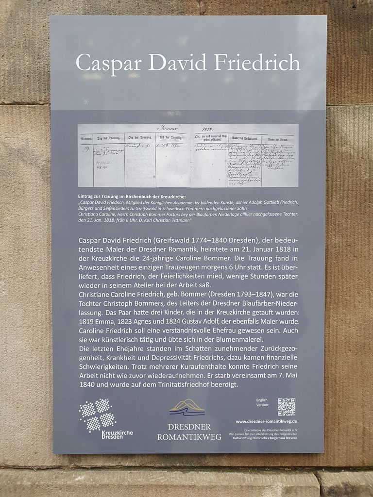 Beim Rundgang durch die Stadt entdeckt man auch andere Hinweise, wie zum Beispiel das Denkmal für den Maler Caspar David Friedrich auf der Brühlschen Terasse vor dem Albertinum. Es ist dem Gemälde Georg Friedrich Kerstings von 1811, „Caspar David Friedrich in seinem Atelier“ nachempfunden. Eine Gedenktafel an der Kreuzkirche erinnert an seine Hochzeit mit der um vieles jüngeren Caroline Bommer im Jahr 1818.