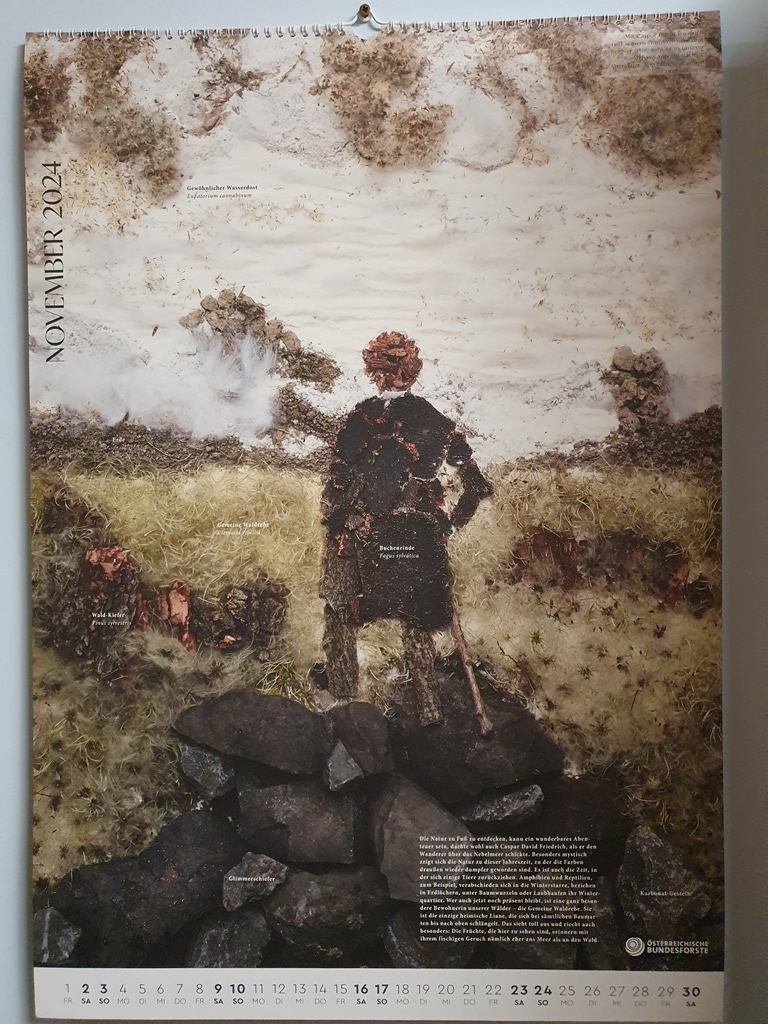 Das letzte Mal war dieses Zusammentreffen mit dem WALD Kalender 2024 der Österreichischen Bundesforste, wo in jedem Monat ein Bild eines anderen Künstlers aus Materialien aus dem Wald dargestellt wird.