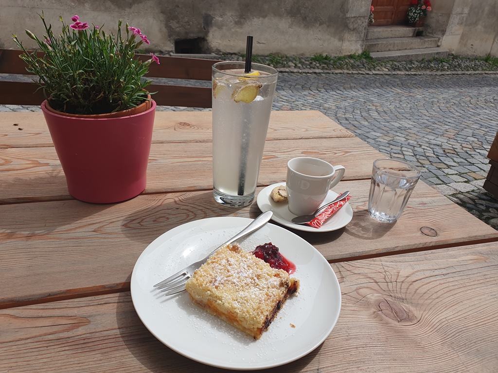 In der netten Ustaria Crush Alba wird man freundlich auf Rätoromanisch begrüßt. Das Lokal ist einerseits Dorfbeiz mit gemütlichen Tischen vor dem Eingang und andererseits ein Feinschmecker-Restaurant, hier gönne ich mir noch einen Kaffee und einen Streuselkuchen, bevor ich wieder zu meinem Motorrad gehe.