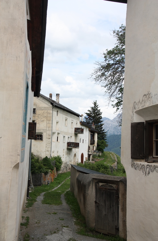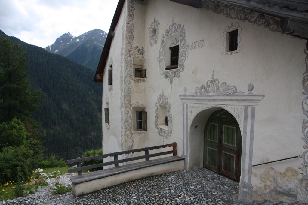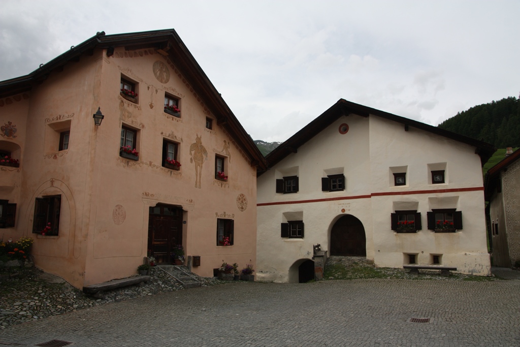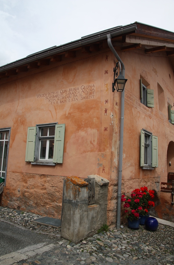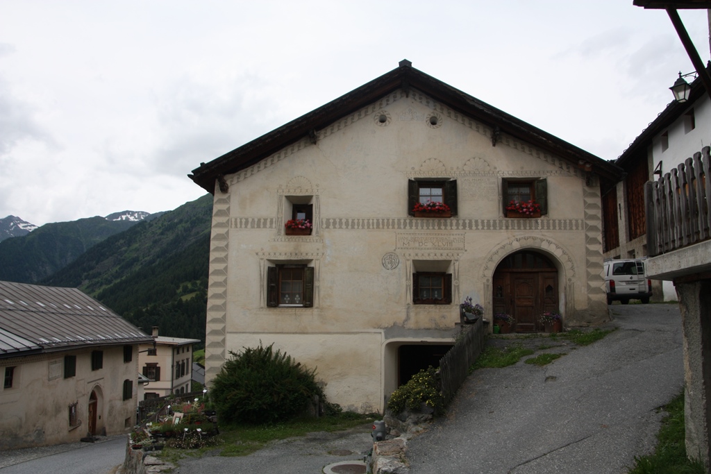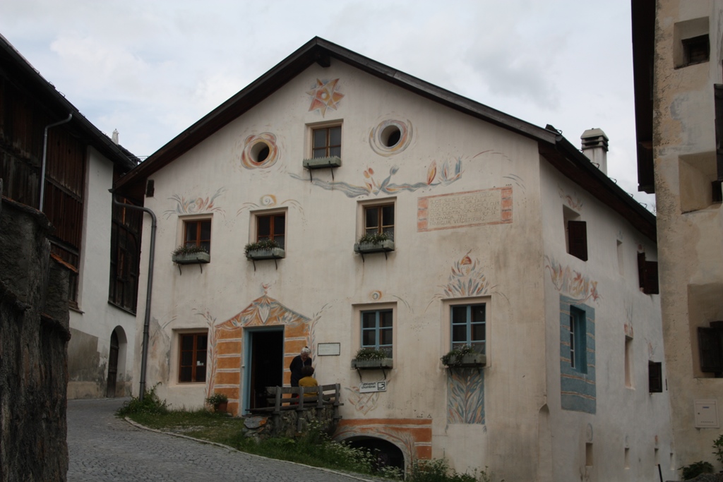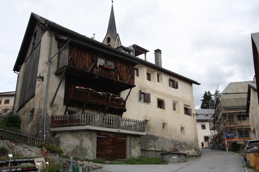 Zu Fuß erreiche ich nach wenigen Minuten die Dorfstraße mit den typischen wunderschönen Häusern mit ihren Engadiner Sgraffiti, die mir schon vor 2 Jahren bei meiner Fahrt über den Albulapass in La Punt aufgefallen sind.