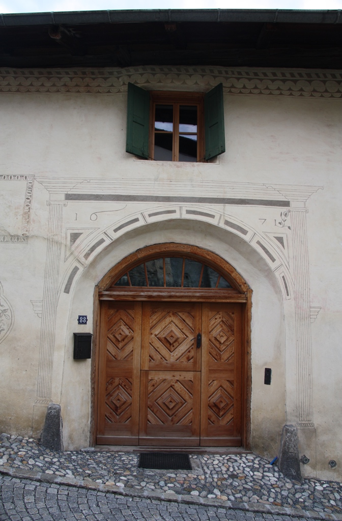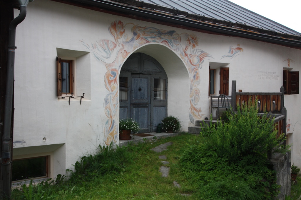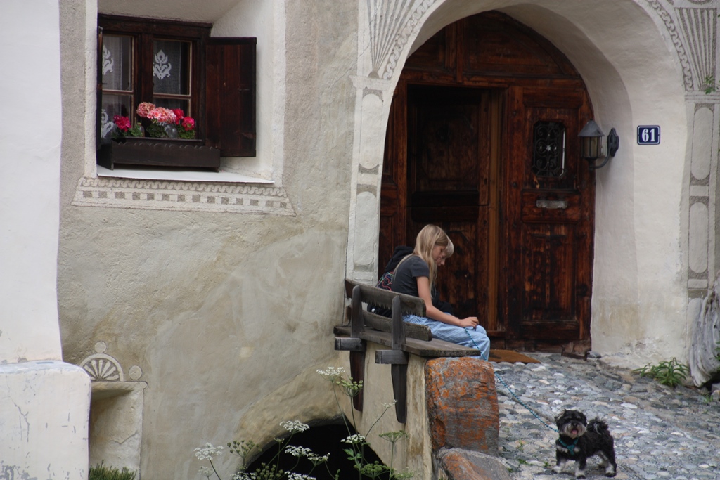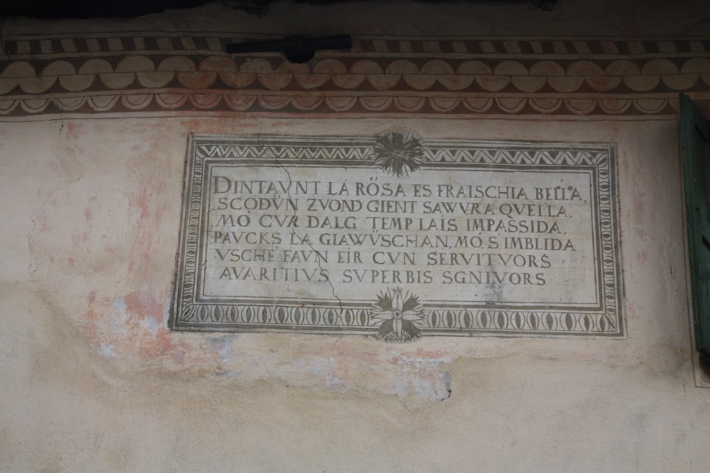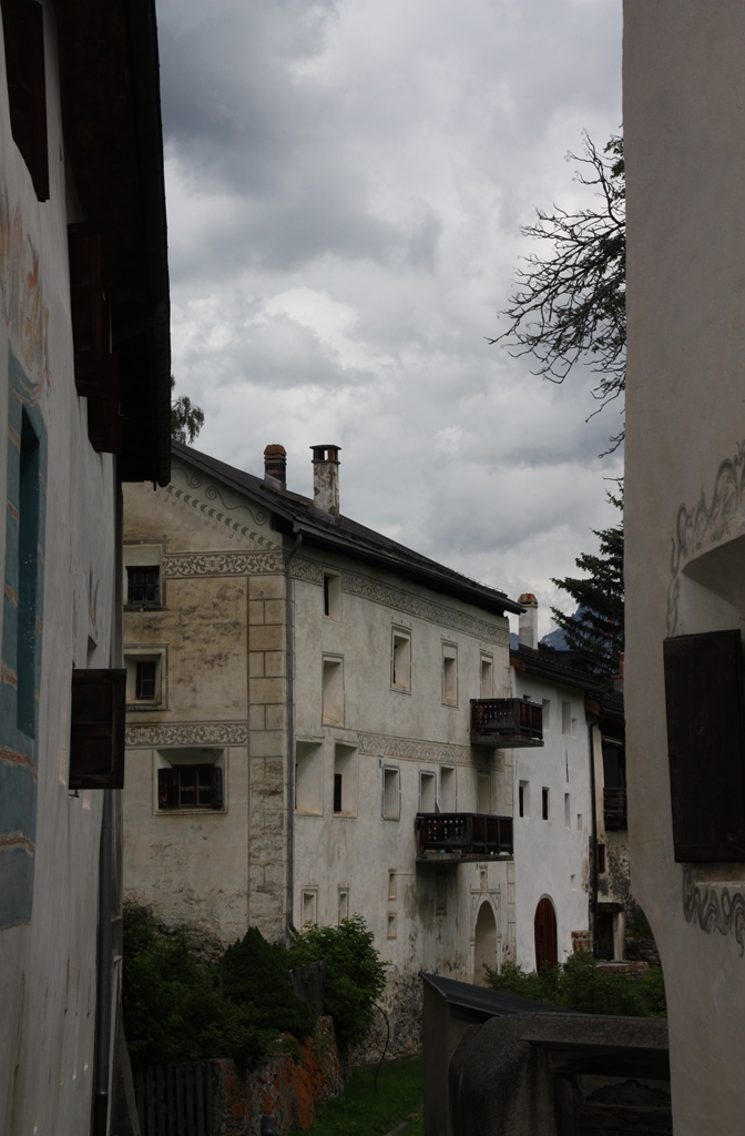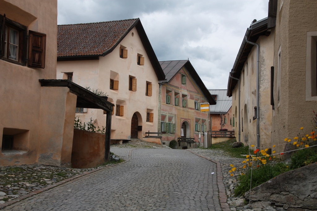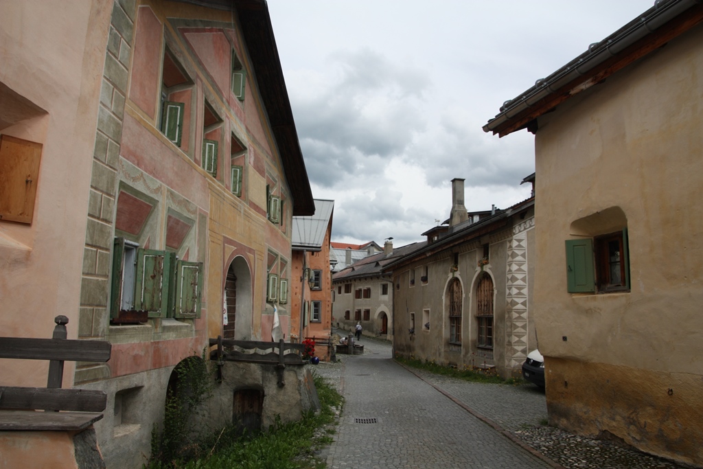Zu Fuß erreiche ich nach wenigen Minuten die Dorfstraße mit den typischen wunderschönen Häusern mit ihren Engadiner Sgraffiti, die mir schon vor 2 Jahren bei meiner Fahrt über den Albulapass in La Punt aufgefallen sind.