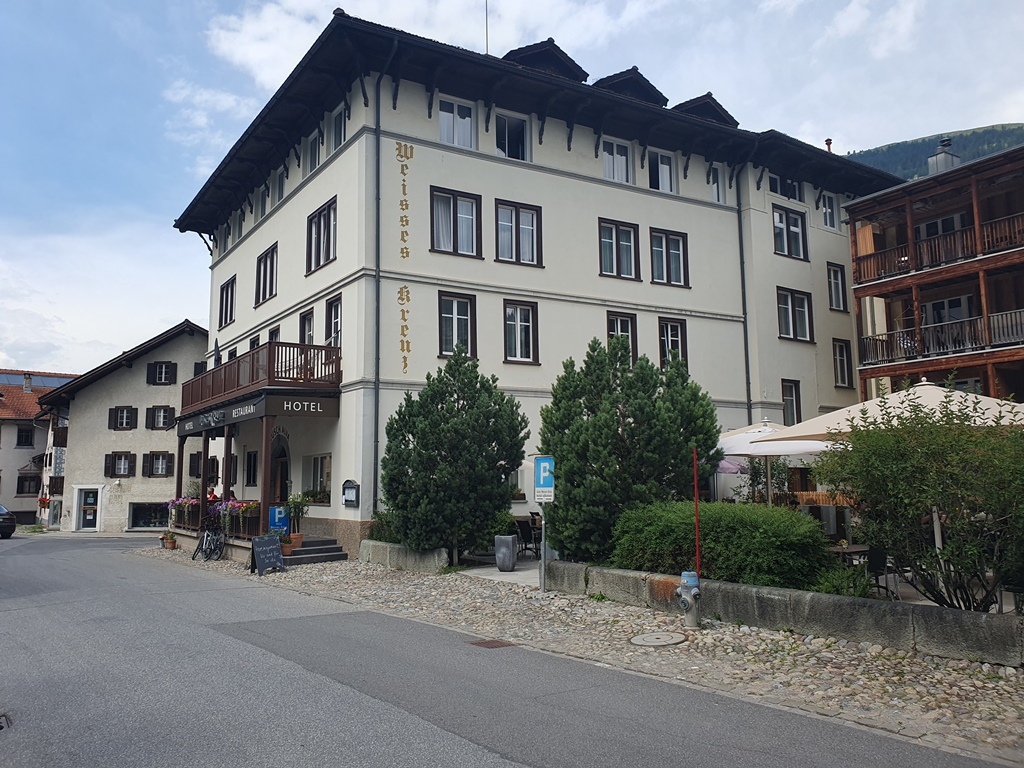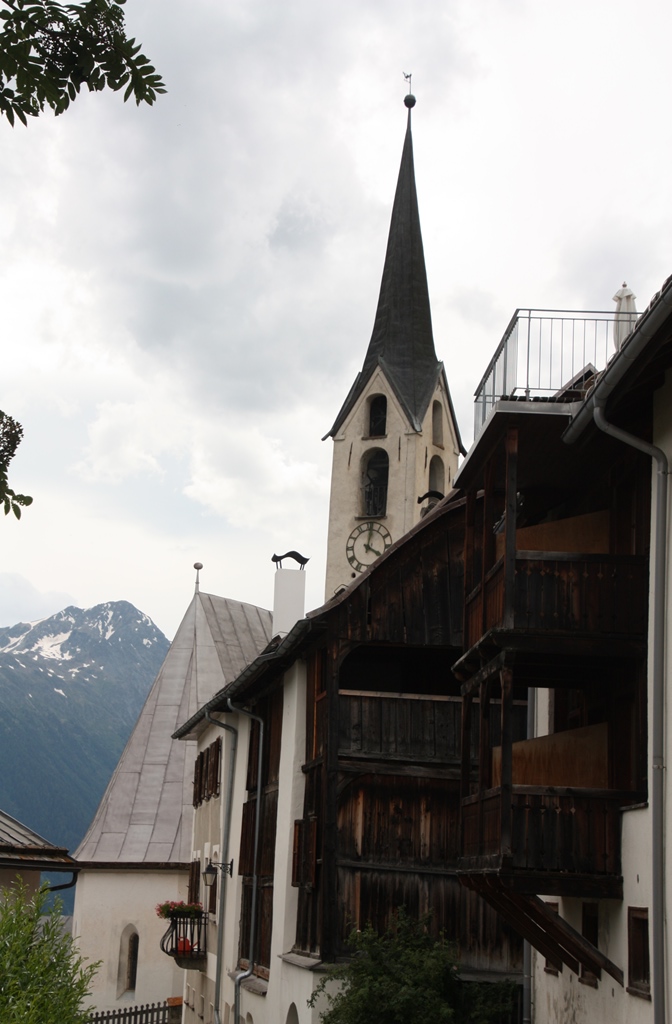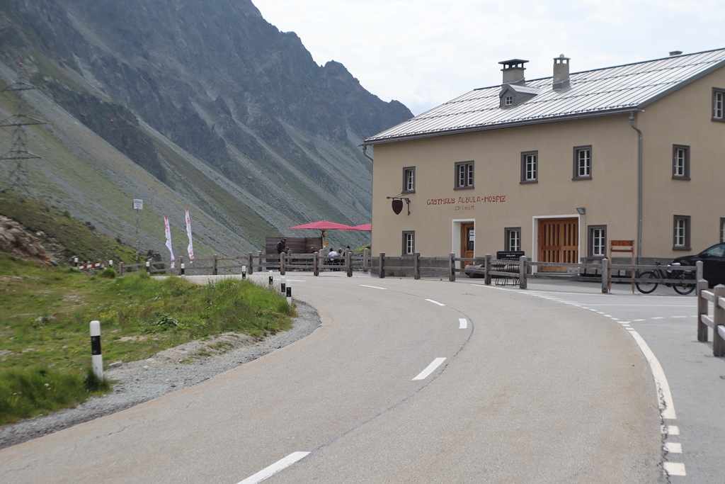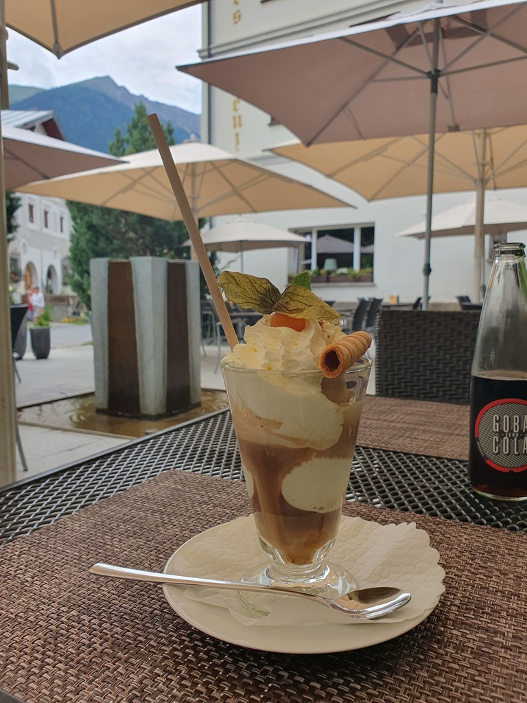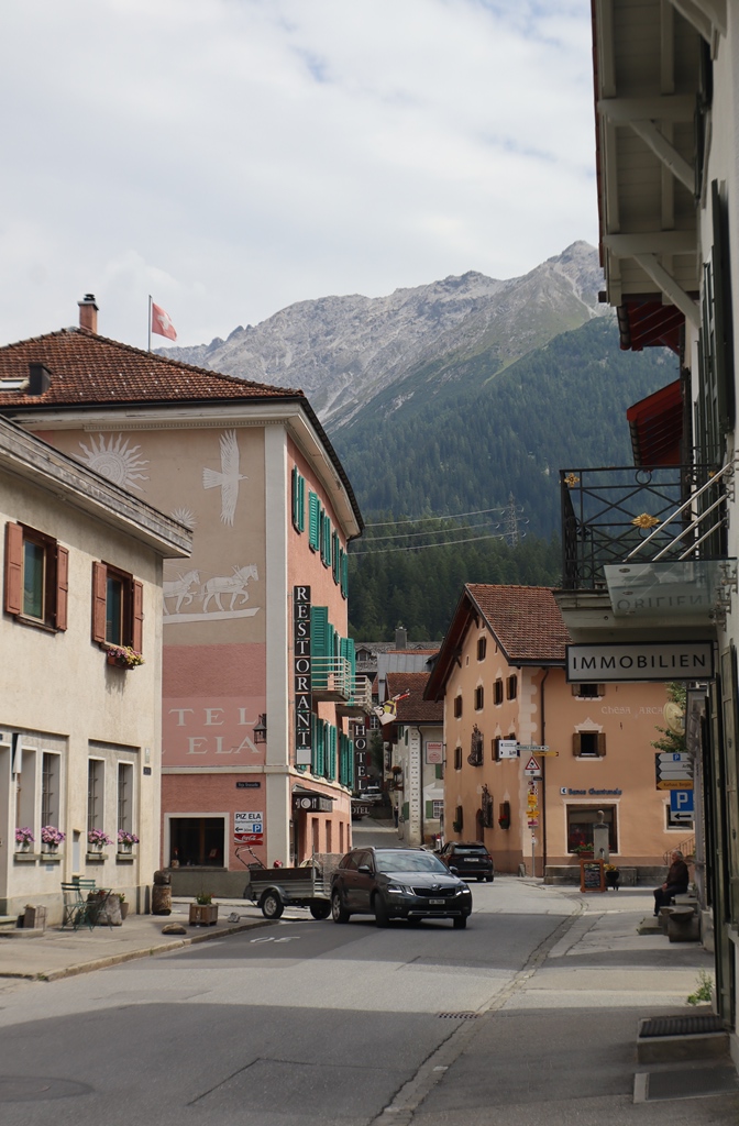Jetzt war es aber Zeit weiterzufahren, ich musste ja noch bis Nauders am Reschenpass kommen und die Wetterapps versprachen verlässlich Regen am späten Nachmittag. Einen Halt in Bergün wollte ich aber dann doch machen, das malerische Dorf ist sehenswert und das letzte Mal vor 3 Jahren bin ich durchgefahren. Außerdem rief nach meinem kurzen Rundgang noch die Terasse des Hotels „Weisses Kreuz“ mitten im Ort mit einem Eiskaffee.