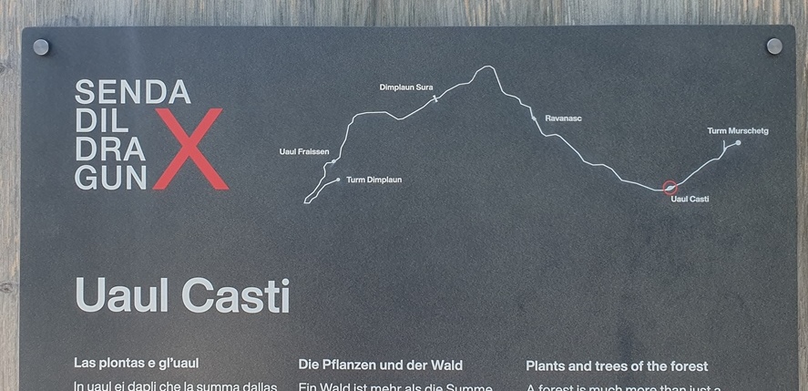 Die Dimplaun Sura Plattform informiert über die Menschen die seit der Bronzezeit diese Region besiedelten, auf der Uaul Fraissen Plattform hat man die wunderschöne Aussicht über das Tal.
