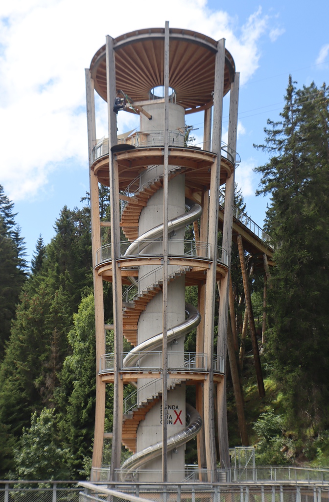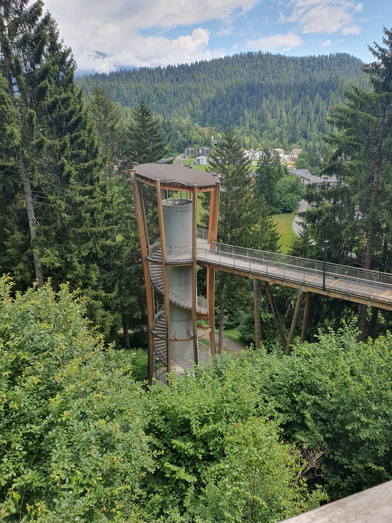 Einige Biegungen weiter erreichten wir den nach rund eineinhalb Stunden Spaziergang den Endpunkt, den 27 Meter hohen Turm oberhalb von Laax-Dimplaun, von dem nach wenigen Minuten den Warteplatz für das Gratis-Elektrotaxi zur Bushaltestelle erreichten. Wir fuhren zu unserem Ausgangspunkt zurück, genehmigten uns noch eine Jause, bis uns der Postbus wieder zurück nach Chur brachte, wo wir wieder in den Zug Richtung Zürich stiegen.