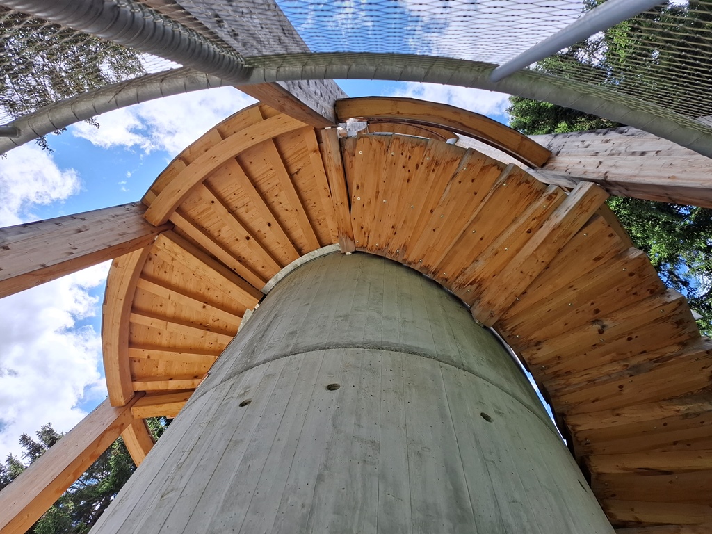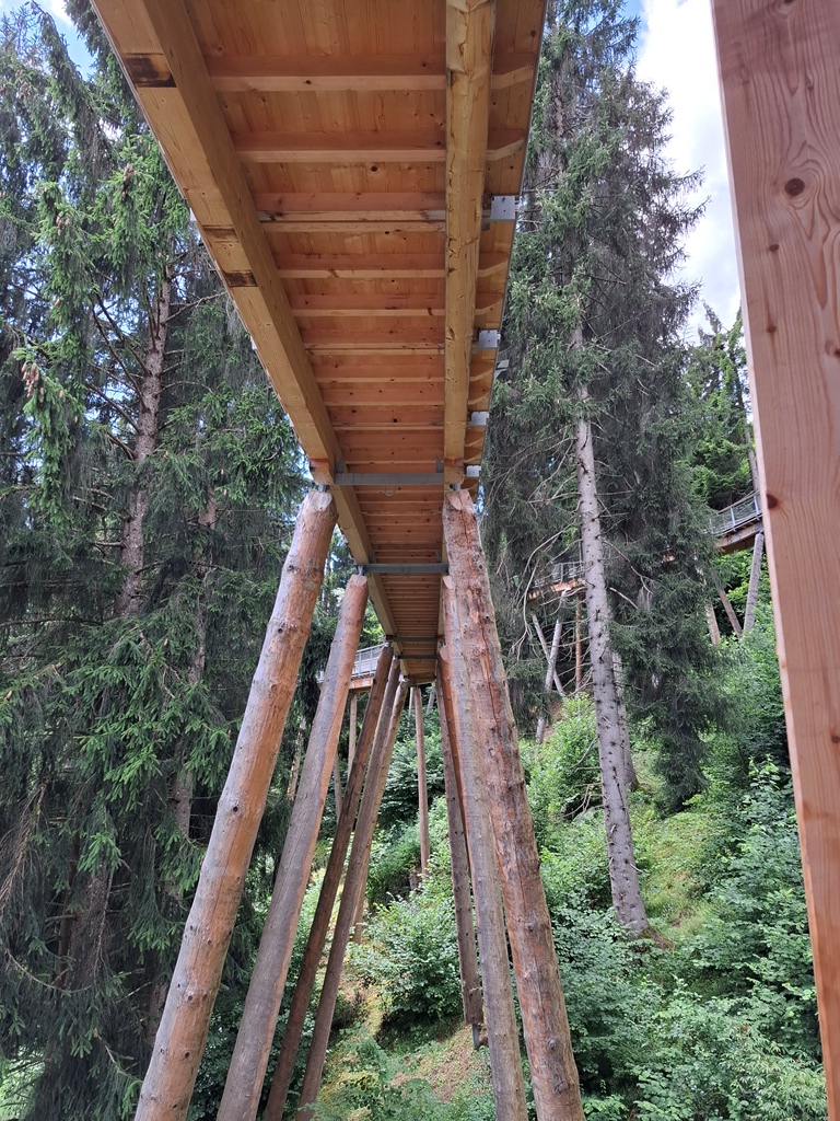 Wir liefen zumindest die Wendeltreppe des 37 Meter hohen Turms hinauf, bis wir auf der Ebene des Pfades waren, der sich in bis zu 28 Metern Höhe befand. Der rund 1,5 km lange und 2 m breite Weg ist in jedem Alter zu begehen und kann auch mit Kinderwagen und Rollstuhl befahren werden. Zur möglichst großen Schonung des Bodens sind die stützenden Baumstämme mit Bodenschrauben und kleinen Punktfundamenten verankert. So wanderten wir bald im Zickzack über und durch die Baumwipfel weiter von Plattform zu Plattform.