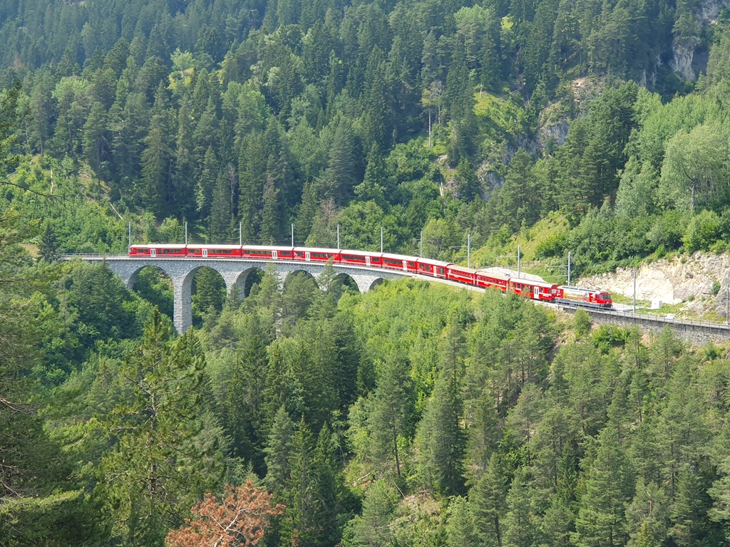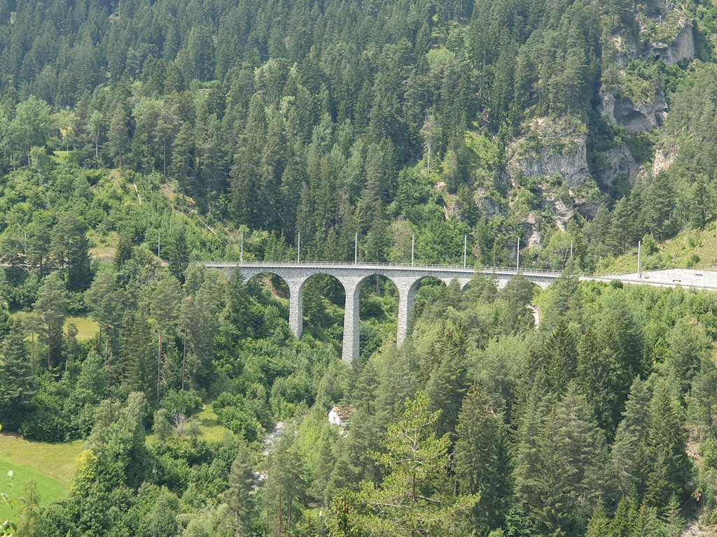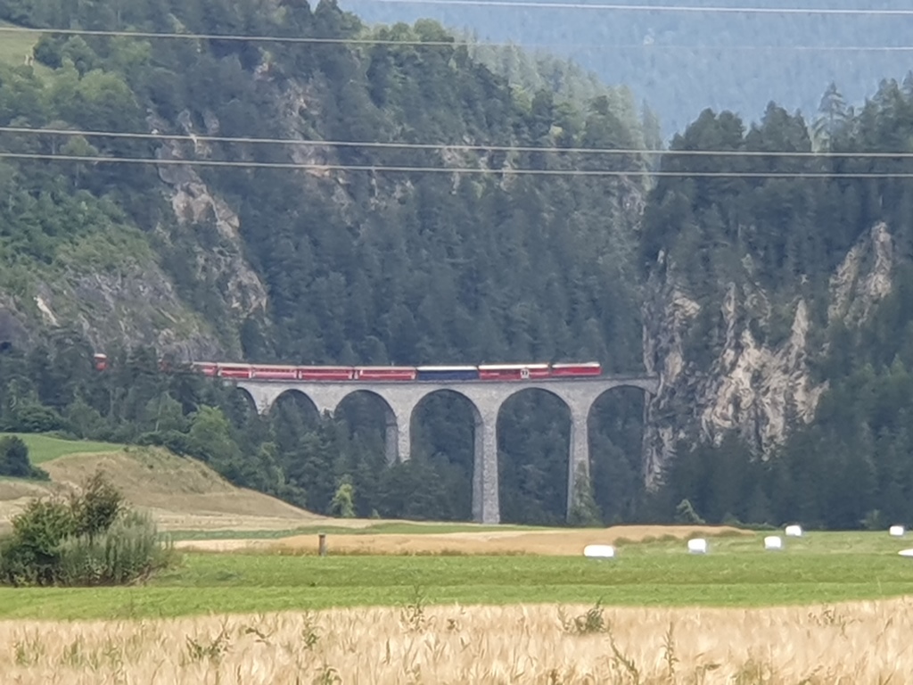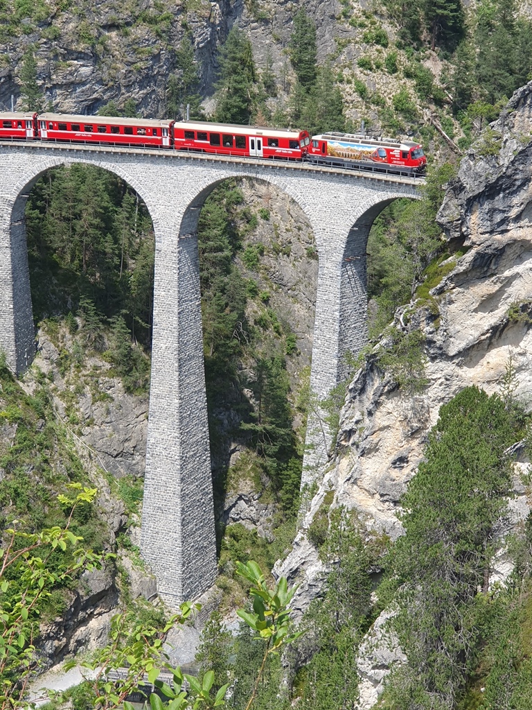 Nur einige Kilometer weiter wartete schon das nächste, jetzt aber komplett positive Highlight, das Landwasserviadukt. Gleich kurz nach der Abzweigung Richtung Davos ist das 65 Meter hohe und 136 Meter lange Bauwerk sehr gut von der Straße aus zu sehen. Zufällig kam auch ein Zug der Rhätischen Bahn, den ich auch fotografieren konnte. Anlässlich meines 50. Geburtstags fuhr ich mit dem Glacier-Express von Zermatt nach St.Moritz auch über dieses Viadukt.