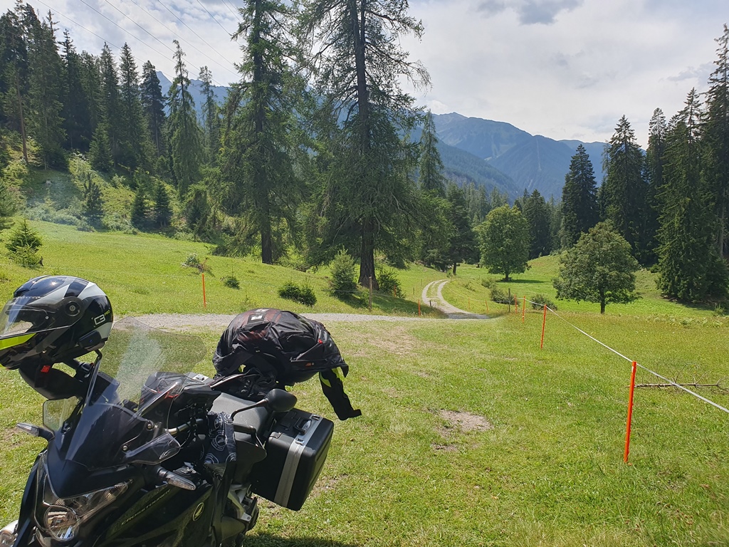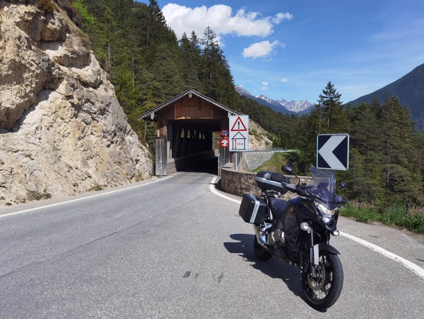 Kurz vor dem Reschensee begann es zu tröpfeln und immer stärker zu regnen, ich wollte mich aber wegen der letzten Viertelstunde nicht mehr die Regenkombi anziehen. Ein Stopp beim berühmten versunkenen Kirchturm von Graun war aber auch nicht mehr drin. Ich war froh dann ziemlich nass beim Gasthaus Zum Goldenen Löwen in Nauders zu landen. Zuvorkommend wurde mir angeboten, meine nasse Motorradkluft im Heizungskeller zu trocknen, was ich gerne annahm. Auch das Abendessen war ein guter Abschluss des an sich schönen Tages, der so doch wieder warm und trocken ausklang.