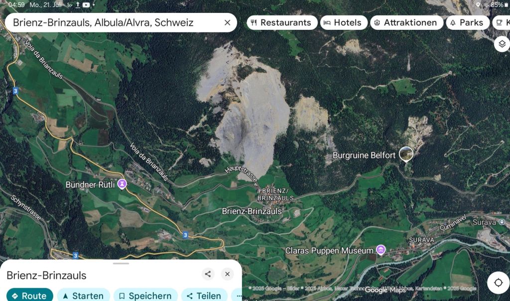 Auf dem Weg hinunter kam ich wie im Vorjahr am Dorf Brienz (in Graubünden, nicht zu verwechseln mit dem Brienz im Berner Oberland am gleichnamigen See) vorbei, das auch heuer wieder wegen der drohenden Felssturzgefahr gesperrt und evakuiert wurde. Ich habe versucht, in die Nähe zu fahren, aber die Straße ist rigoros gesperrt, bevor man etwas sieht und ich musste umkehren.