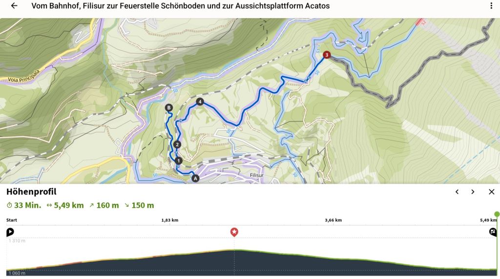 Ich wollte aber näher heran und von der Aussichtsplattform bei Filisur das Geschehen beobachten und fotografieren. Da keine Fahrverbotstafel zu sehen war, beschloss ich, einfach weiterzufahren. Das schmale Sträßchen führte immer weiter den Berg hinauf, bis der Asphalt aufhörte und einige hundert Meter weiter auf einer kleinen Anhöhe endete. Wie an vielen Schweizer Orten gab es dort eine kleine Grillstelle, bei der zwei junge Familien ihr Picknick bei einem kleinen Feuer starteten. Das „Grillieren“ gehört beim Wandern für Schweizer Familien unbedingt dazu, deswegen sind diese Grillstellen auch im Internet verzeichnet, so auch diese am Schönboden.