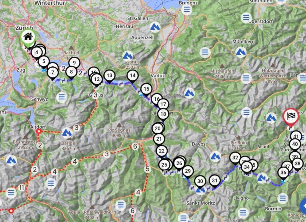 Der letzte Teil am 4. Tag meiner Reise soll dann auf der alten Poststrasse durch die Rheinschlucht und dann weiter über den Oberalppass, den Furka und den Grimselpass bis zum Stausee und danach in einer Schleife über den Nufenen nach Airolo im Tessin und dann auf der Tremola über den Gotthardpass führen. Das letzte Stück von Andermatt mit der Teufelsbrücke und weiter auf den Klausenpass über Glarus bis an den Zürichsee ist der Abschluss des letzten Tages.