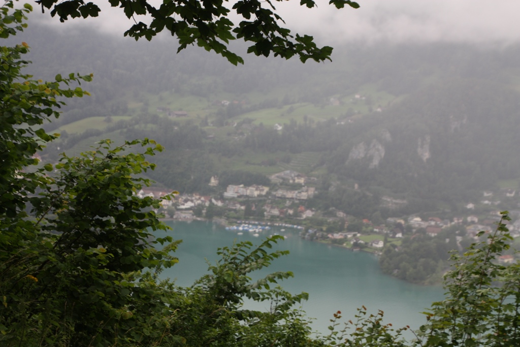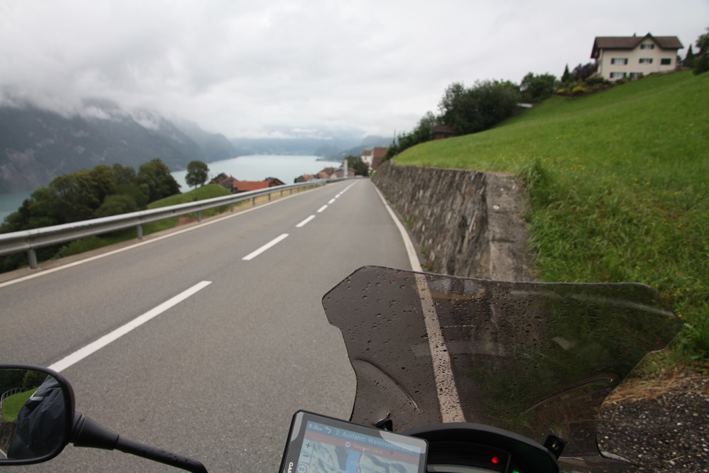 Die Straße schlängelt sich bald den Berg hinauf mit Blick auf den Walensee, der Blick hinunter aufs Wasser ist schon recht malerisch.