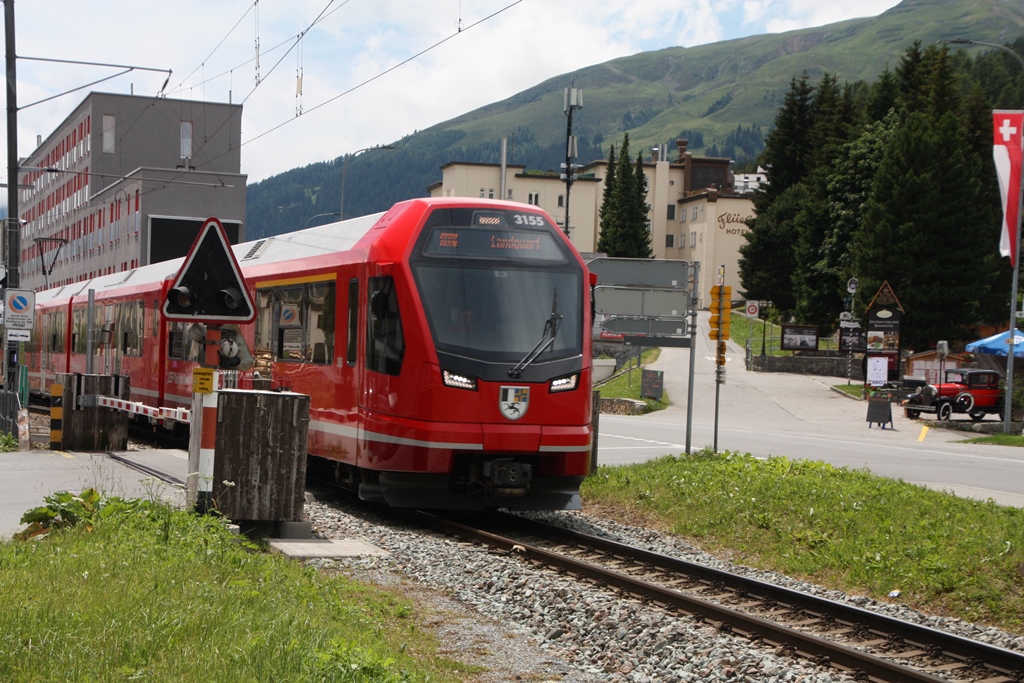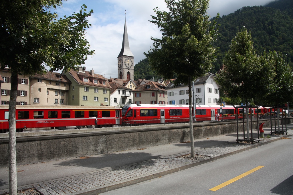 Weiter geht es dann nach Chur, wo ich falsch abbiege und im Stau Richtung Arosa stehe. Dabei habe ich das Glück, in der Haltestelle Chur-Altstadt einer Garnitur des Arosa Express zu begegnen, die hier wie eine Straßenbahn unterwegs ist. Sowohl der Bernina Express Richtung Poschiavo/Tirano, der Glacier Express Richtung Zermatt sowie die Arosabahn fahren direkt ab Chur.