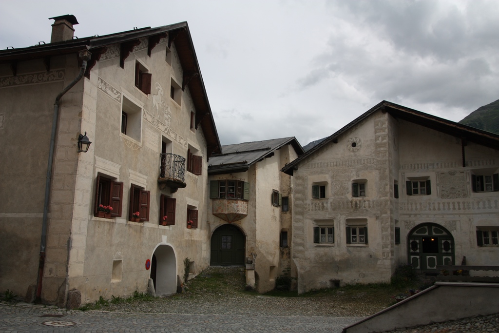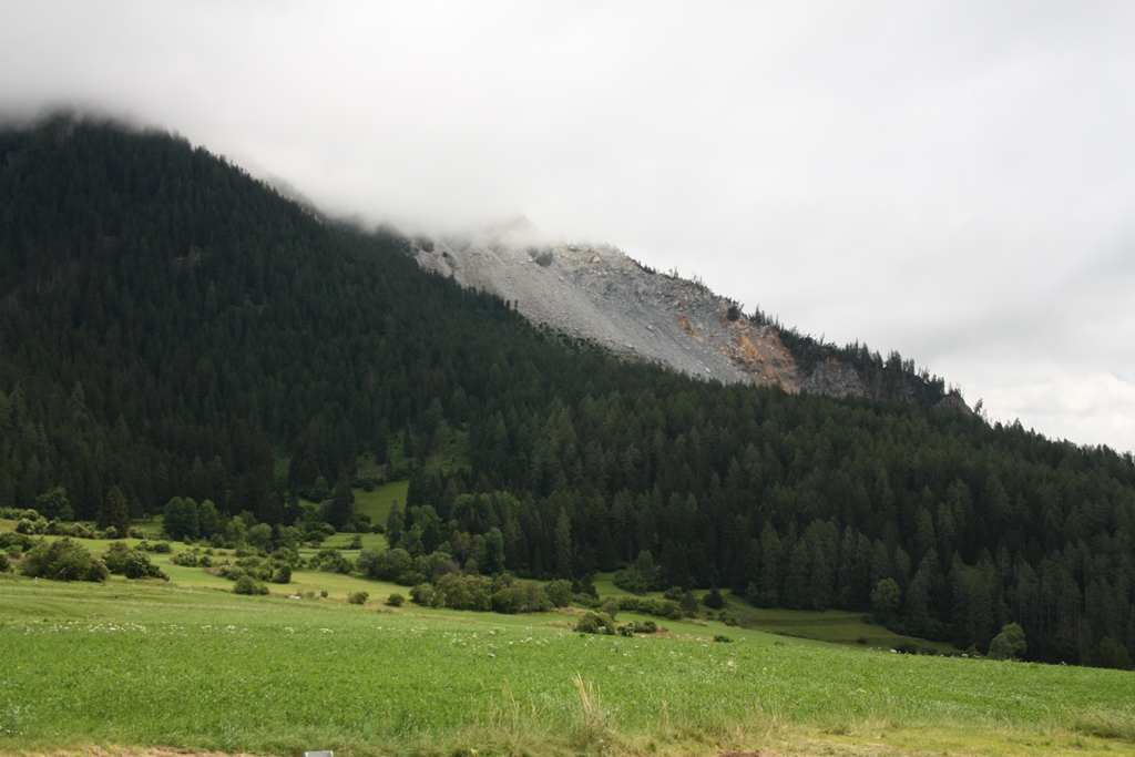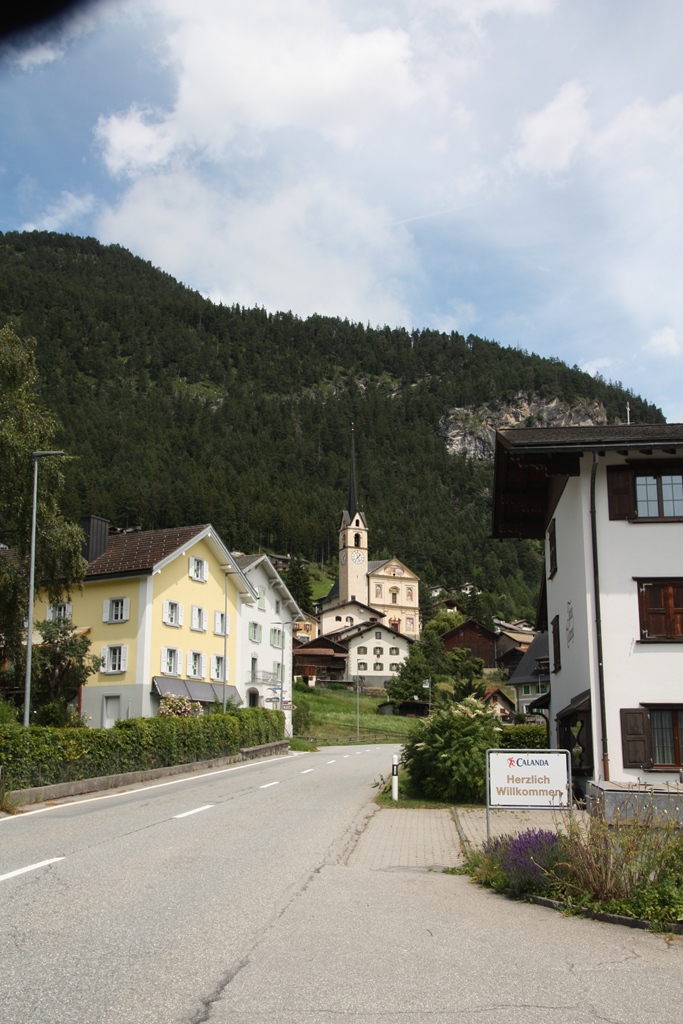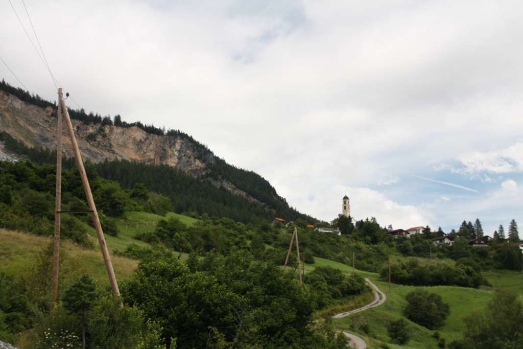 Danach geht es bergan nach Lenzerheide, oftmaliger Austragungsort für das Alpinschi Weltcupfinale und 2025 sollen die Biathlon-Weltmeisterschaften hier stattfinden. Nachdem die Stadien dafür im Sommer nicht sehr aufregend sind, fahre ich ohne Halt weiter fast bis Tiefencastel, dabei fällt mein Blick links auf den Felssturz, der im Vorjahr die Evakuierung des Bergdorfes Brienz auslöste, aber knapp vor dem Schulhaus zum Stillstand kam. Die Zufahrt nach Brienz ist nur Einheimischen gestattet, darum gibt’s von mir nur einige Bilder von der Hauptstraße aus.
