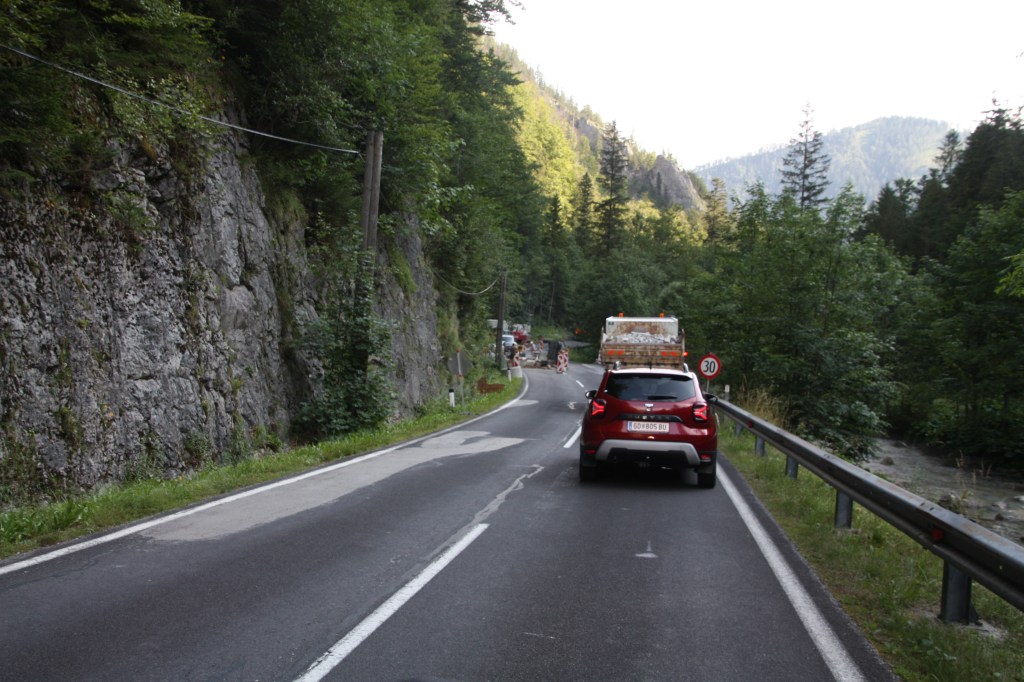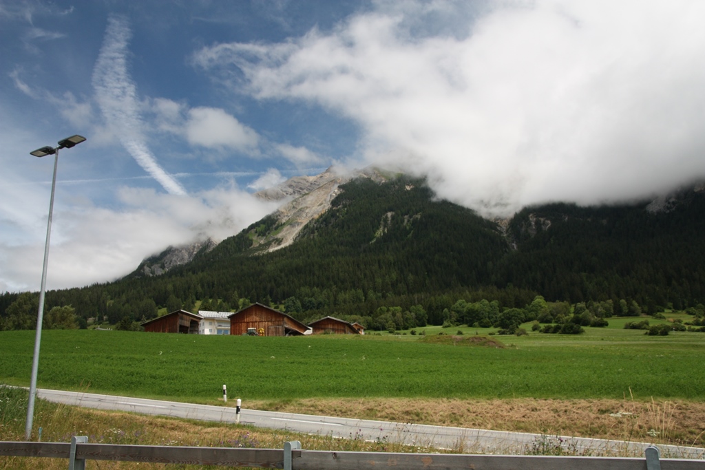 Nach dem recht günstigen Tanken und Parfümeinkauf geht es harmlos die Straße Richtung Spiss ins Inntal hinunter. Der österreichische Zöllner winkt mich durch, ich sehe nicht aus wie ein Rolex-Käufer. Bald bin ich an der Stelle bei Tschupbach, die gestern noch vermurt war, hier türmen sich links und rechts der Straße die Geröllberge, der Vergleich mit dem Auto verdeutlicht das Ausmaß. Die Landesstrasse ist noch länger verschüttet und das Ganze ging nur knapp an den Häusern vorbei.