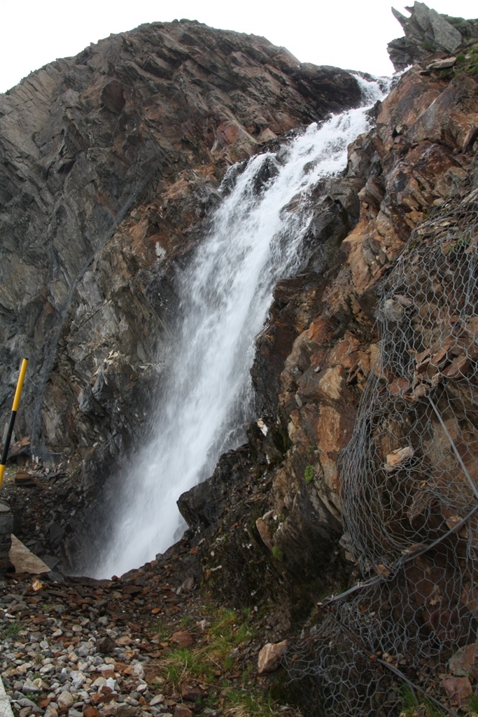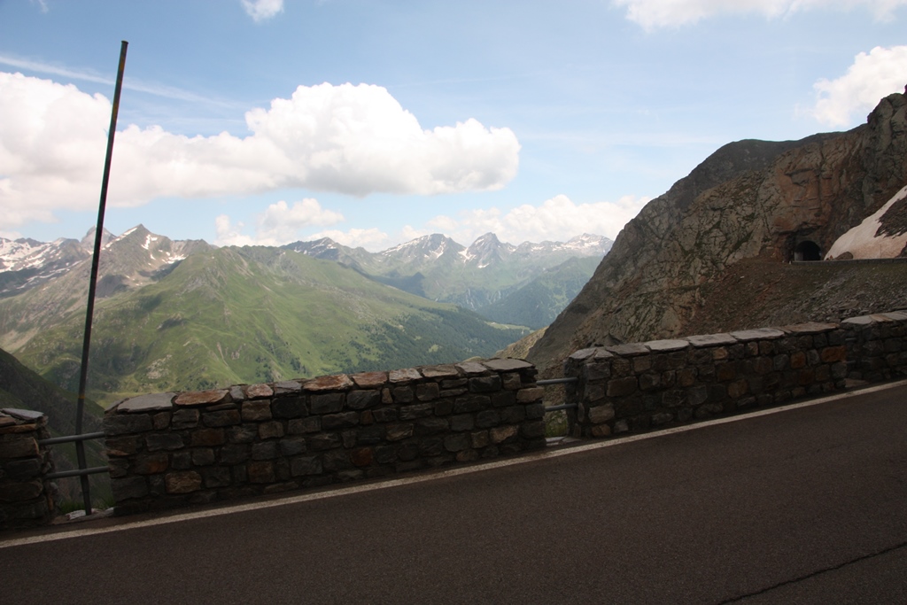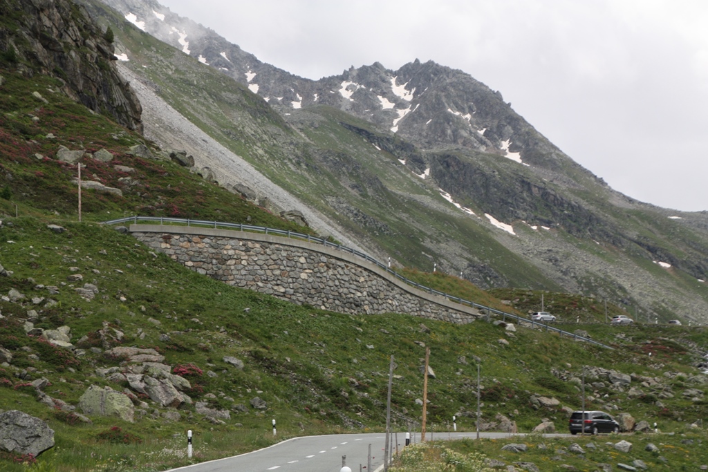 In Davos, wo ich nicht anhalte, geht es über den nächsten Pass, den 2383m hohen und 27 km langen Flüela. Hier wird derzeit die Fahrbahn auf der Bergabstrecke verbreitert, was zu erheblichen Staus führt. Als Biker hat man es etwas leichter, ich schlängle mich mit 2 deutschen Kollegen kilometerweit vor und gewinne mindestens eine halbe Stunde.