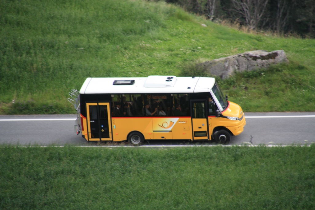 Beim Hinunterfahren ins Tal begegnet mir fast klischeehaft das Postauto, das den Bahnhof im Tal mit dem Dorf verbindet.