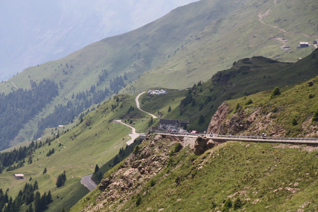 Nach einer kühlen Stärkung und nach Bezahlung von 17 Euro an der Mautstation geht die Fahrt weiter zuerst hinauf auf die Passhöhe von 2474m und dann weiter 30 km hinunter bis St.Leonhard in Passeier. Hier verfranse ich mich etwas und fahre falsch aus dem Kreisverkehr. Dabei entdecke ich ein malerisches schmales Strässchen, wo mir relativ schnell klar wird, daß ich falsch bin. Weil es so schmal ist, kann ich erst bei der ersten Haarnadelkurve umdrehen. Kurz danach kommen mir einige italienische Biker entgegen, daher denke ich einen Insidertipp entdeckt zu haben, der auf jeden Fall wert ist gefahren zu werden.