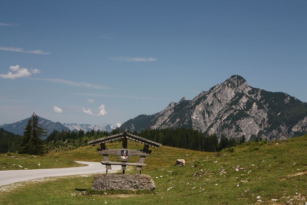 Nach einem ausgiebigen Frühstück im schattigen Gastgarten fahre ich den Pyrnpass hinunter bis Windischgarsten und biege dort rechts in den Hengstpass ab. Obwohl nur 985m hoch, ist diese Straße zwischen Reichraminger Hintergebirge und den Haller Mauern nach Altenmarkt schon allein wegen der Aussicht wert zu fahren.