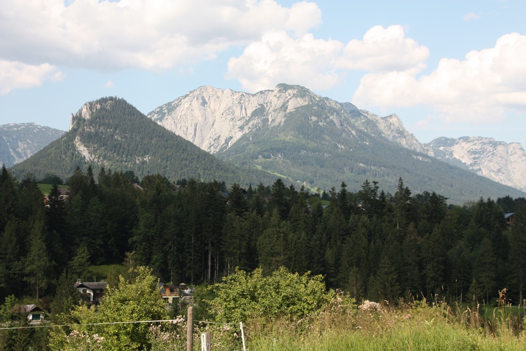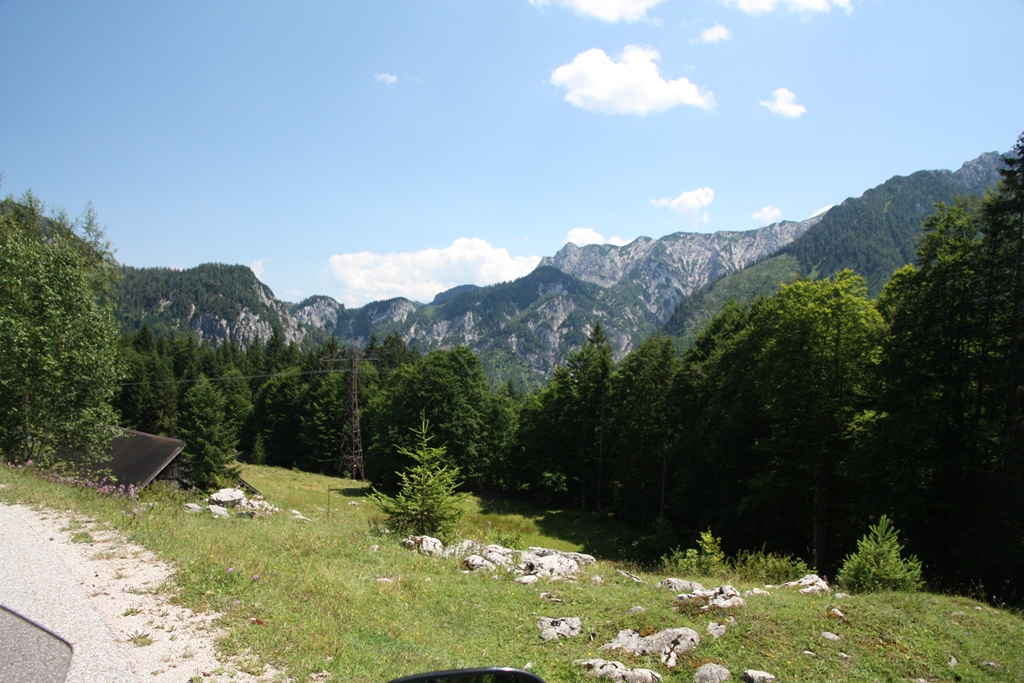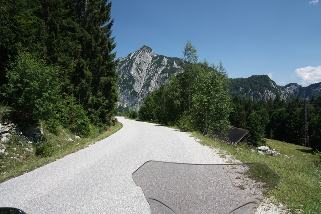 Leider sind dort die Motorrad-geeigneten Parkplätze weit weg und alles voll von Autos, Bussen und Touristen, heiß ist es dazu auch noch, so drehe ich um und fahre wieder an der Hallstättersee, vorbei an Hallstatt Richtung Koppenpass. Hier zwingt mich die Aussicht auf Loser und Trisselwand nochmals für einen Fotostopp.