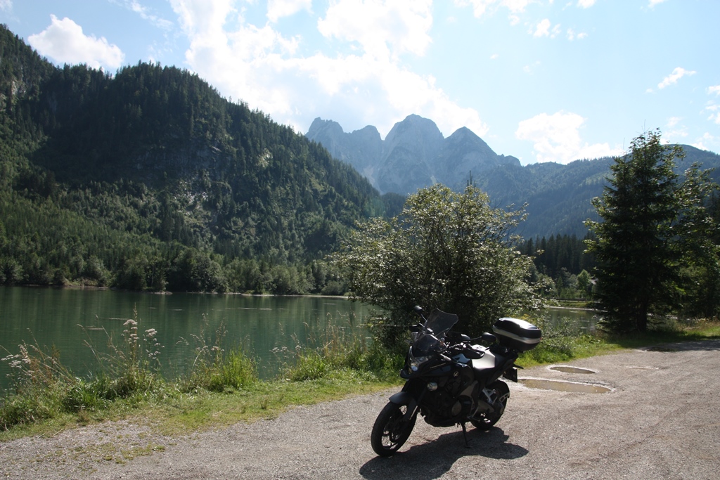 Am Wolfgangsee waren wir erst vor einigen Wochen bei unserem Salzkammergut-Radweg-Urlaub, darum fahre ich weiter vorbei an Bad Ischl nach Bad Goisern, wo im Supermarkt schon eine Wurstsemmel nach mir ruft. Mit dem Fahrrad sind wir ja vor kurzem das linke Ufer des Hallstättersees entlang gefahren, darum nehme ich mit dem Motorrad die rechte Uferstrasse und biege dann, weil es noch so früh ist ab, um noch zum Gosausee zu fahren.