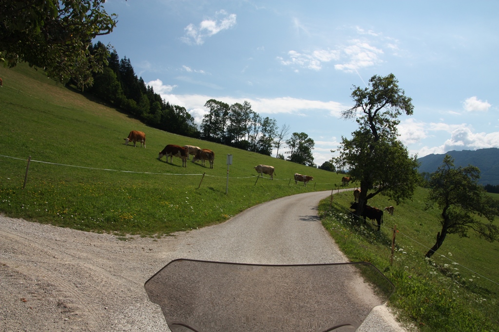 Mein nächstes Ziel ist die Postalm, daher geht’s zurück über Eben auf die B166 durchs Lammertal. Kurz nach Abtenau zweigt rechts die Straße Richtung Postalm ab. Hier ist Vorsicht angebracht, viele Streifen und Flecken sind ausgiebig frisch mit Rollsplit ausgebessert. Dann kommt bald die Mautstation und nach Bezahlung von 7 Euro für das Motorrad geht es über die 28,5 km lange Panoramastrasse über das größte zusammenhängende Almgebiet Österreichs nach Strobl am Wolfgangsee. Der Blick auf Dachstein und Bischofsmütze ist unvergleichlich.