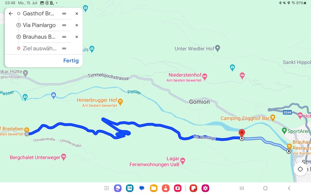Jetzt fahre ich die richtige Ausfahrt aus dem Kreisverkehr und durchs Ortsgebiet von St.Leonhard Richtung Jaufenpass. Hier geht’s mit bis zu 11,5% hinauf und dann in schönen Kurven aber mit schlechtem Straßenbelag nach Sterzing hinunter. Von der Vermurung von vor 2 Tagen bemerke zumindest ich nichts mehr.