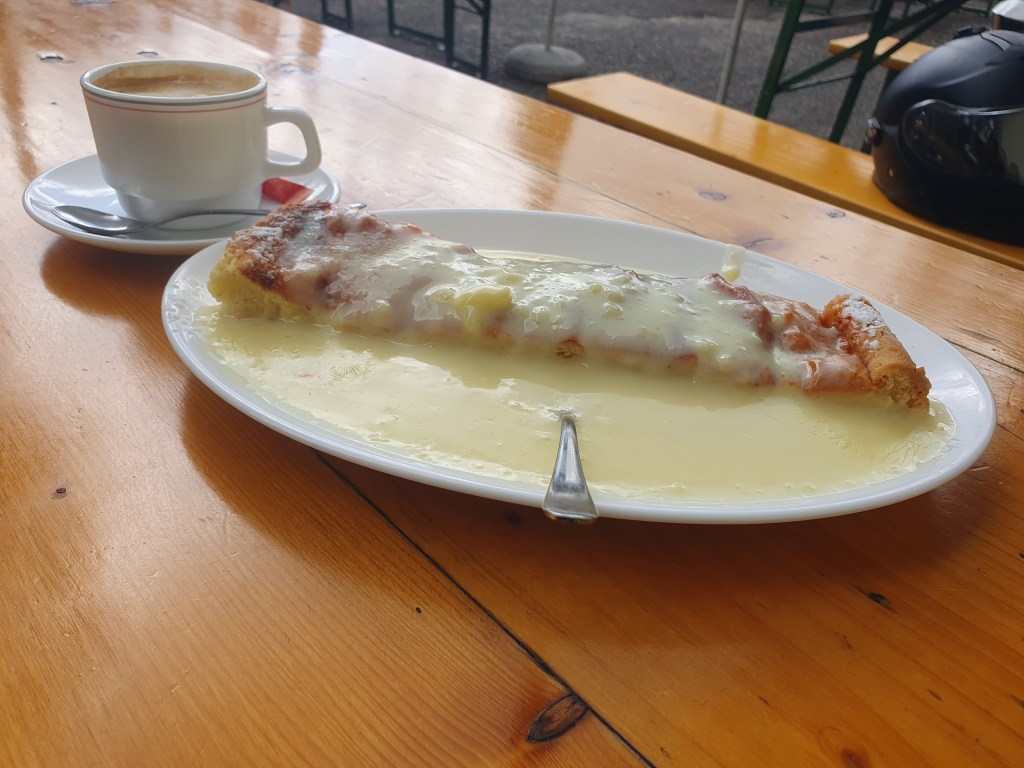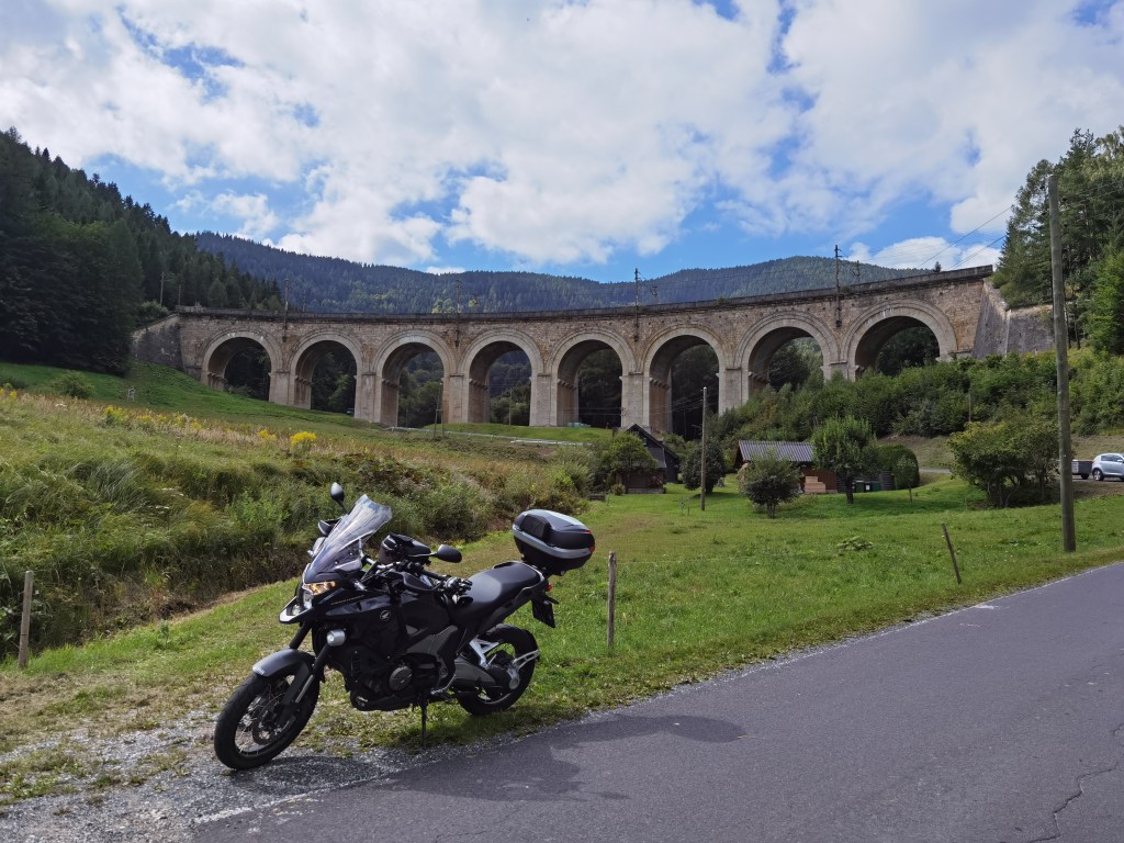 F. mit seiner nagelneuen BMW GS 1300, die am Nachmittag in Wr.Neustadt ihr erstes Service bekommen soll, und W. mit der giftgrünen Kawasaki Ninja 1000SX kommen über Schwarzenbach und den Ochssattel zur Kalten Kuchl, wo wir uns treffen und dann gestärkt mit dem obligatorischen Topfenstrudel mit Vanillesauce gemeinsam über Rohr am Gebirge und das Klostertal ins Höllental fahren. Da beginnt es immer stärker zu regnen, so beschließe ich, mit ihnen statt wie geplant von Reichenau vorbei am Looshaus auf den Semmering zu fahren, dem Schlechtwetter auszuweichen und den Weg über Gloggnitz und Maria Schutz zu nehmen. Der Regen hat praktisch aufgehört, daher wähle ich die imposantere Strecke durch die Adlitzgräben, wo uns schon wieder die Feuchtigkeit von oben einholt und ich daher statt über Breitenstein und das Südbahnhotel den kürzeren Weg am Bahnhof vorbei nehme. Im Ort Semmering finden wir ein Kaffeehaus auf der Hochstrasse, wo wir uns aufwärmen, trocknen und den Kaffee und ein Nusskipferl genießen können.