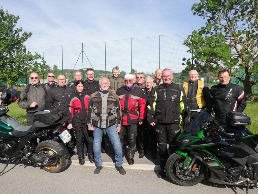 Schon der Sonnenaufgang am Samstagmorgen verspricht einen schönen Tag, daher wasche ich noch rasch den Dreck vom Donnerstag vom Bike, tanke voll und fahre zum vereinbarten Treffpunkt beim (aut)back, um auf die mitfahrenden Freunde zu warten. Es ist jedesmal wieder eine Überraschung, wie viele mitkommen werden, und kurz vor der pünktlichen Abfahrt sind wir insgesamt 13 Motorräder.
